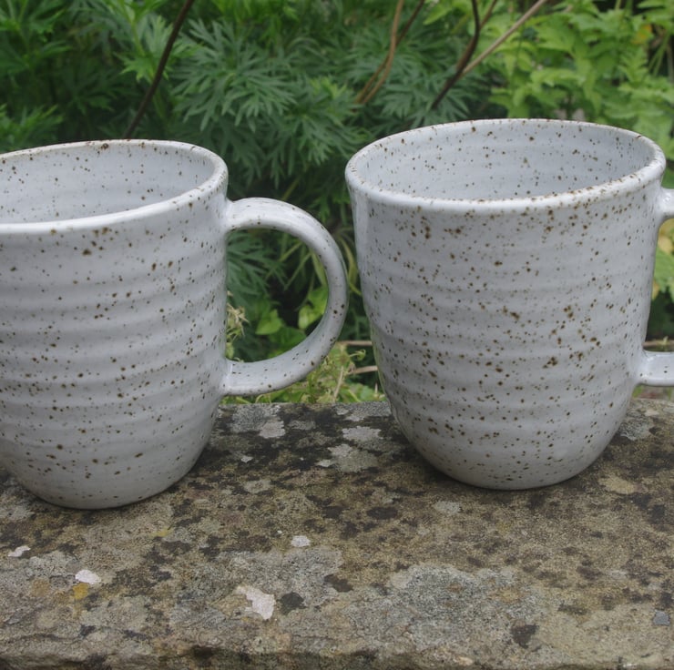 These cups were wheel thrown with buff stoneware clay. When dried to leather hard a handle was attached and stamped with my J-S logo. They were bisque fired at 1000C then dipped in a zircon glaze. Then refired at 1260 C in my gas kiln taking 3 days to heat up and cool down and developing a nice speckle from the clay.