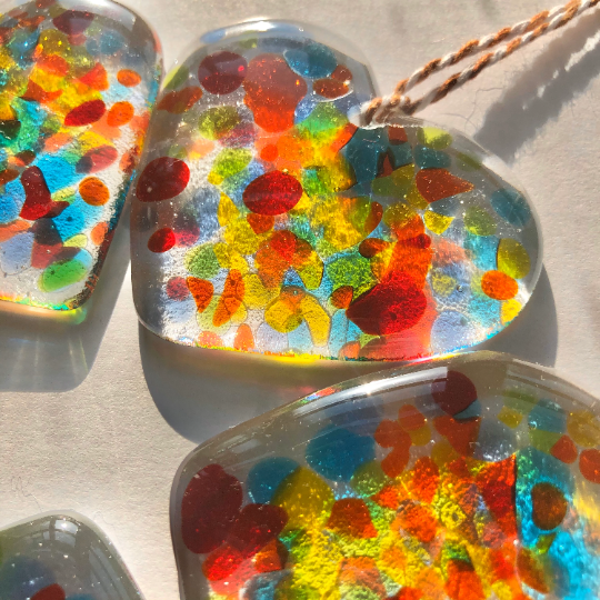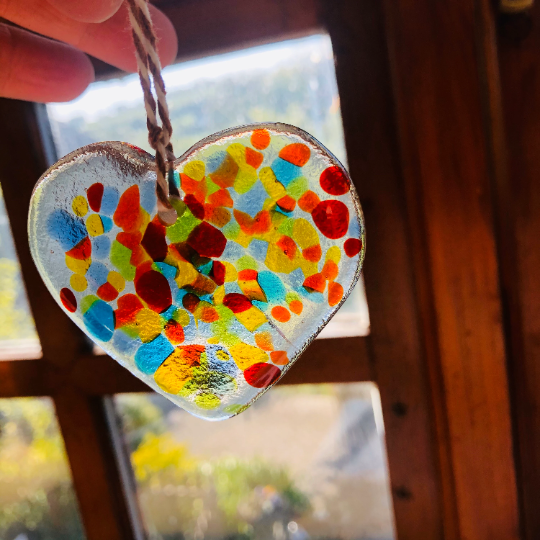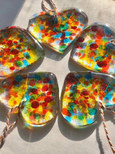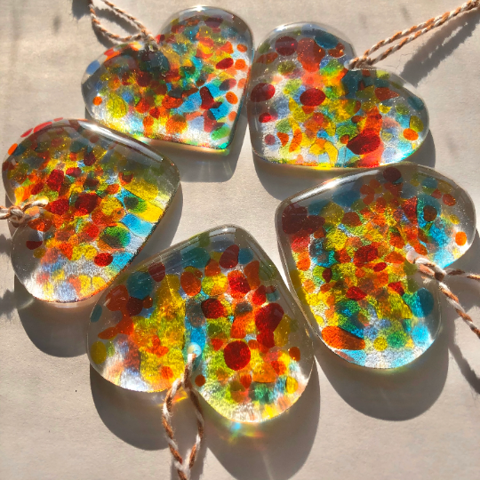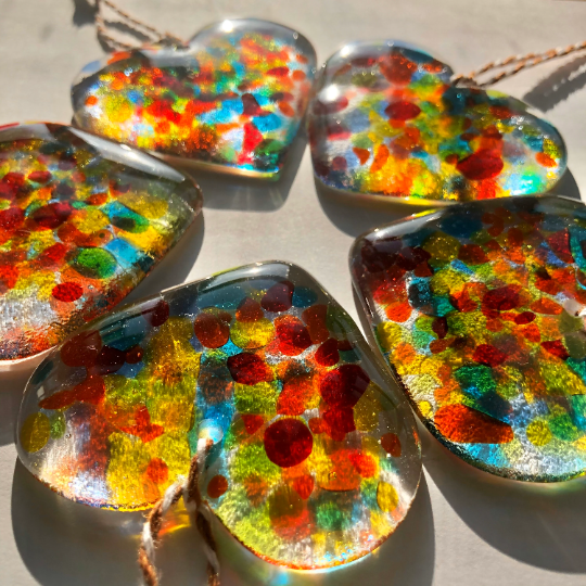 This version can include the cremains of a loved one, either human or pet, you just need to send me a sprinkle of ashes (half a teaspoon will make 6 hearts) and I will fuse between 2 layers of glass and decorate with six colours of cheerful transparent glass. The heart can be drilled for hanging or left whole to be kept as a "pocket" heart.