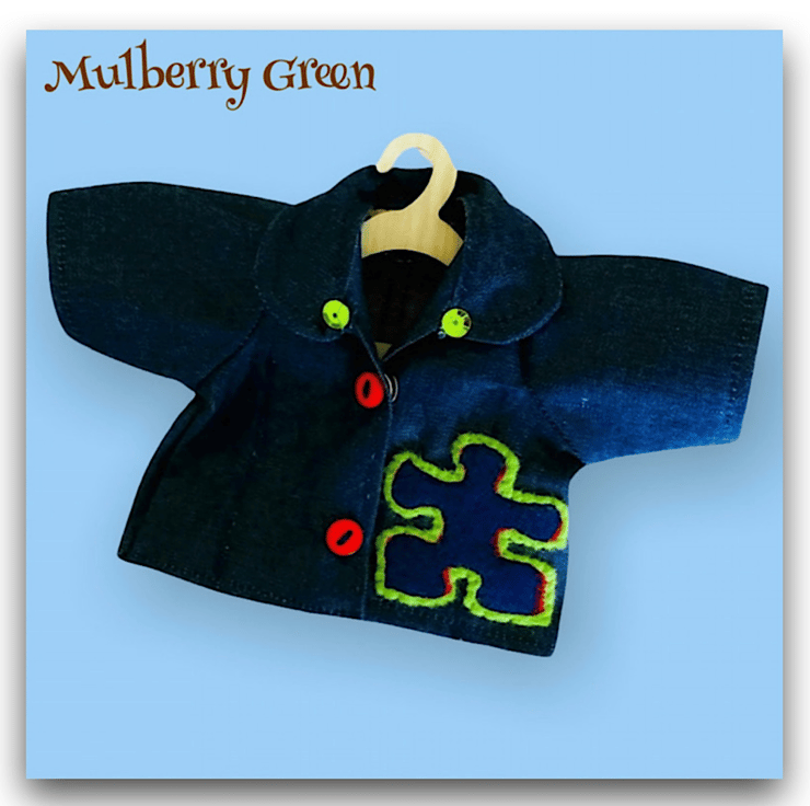 A little denim jacket, appliquéd with an embroidered jigsaw piece to fit the Mulberry Green characters. The jacket is a top rather than a coat - it will fit over the sleeveless blouse but not over a jumper. It looks really nice with any of the skirts in the ‘Jigsaw’ collection in my shop.