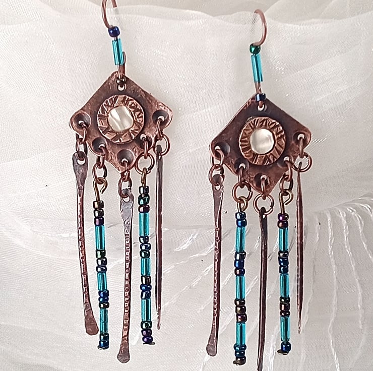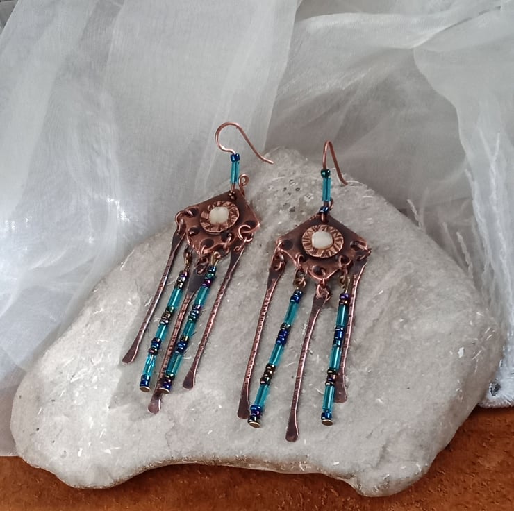 Finished with hand made copper ear wires with more seed beads to complete the design. Oxidised to give an antique finish and sealed with a silicon wax polish.
