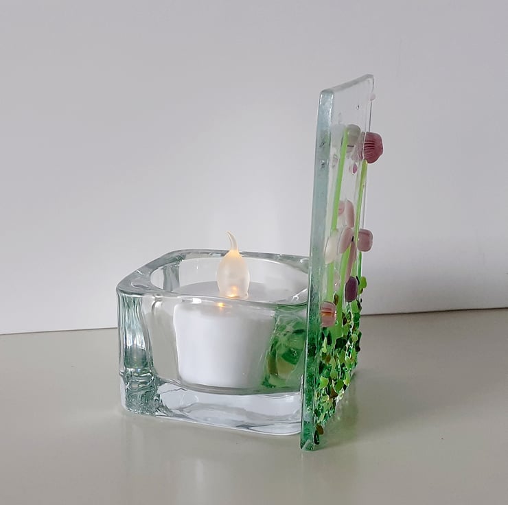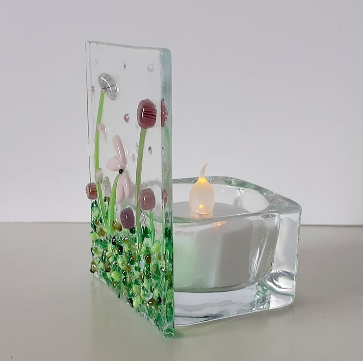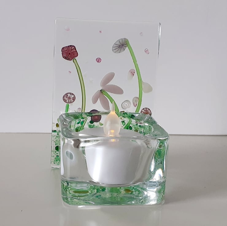 Fused glass panel tealight holder, decorated with a variety of flowers in soft shades of lilac and mauve, together with a scattering of mixed green foliage. Each panel made in my garden studio is unique.
