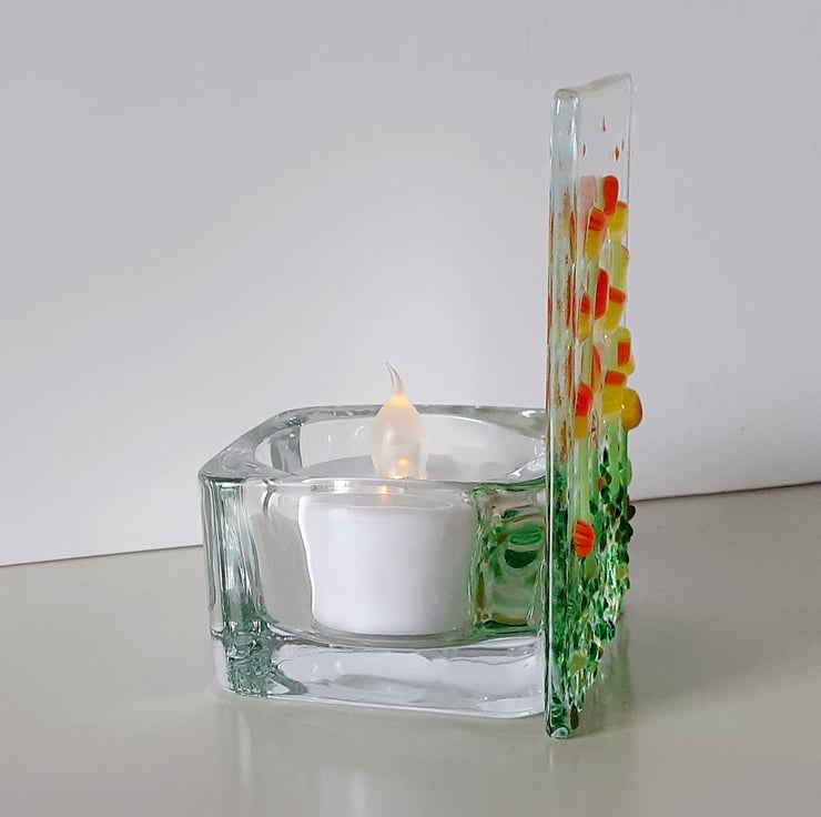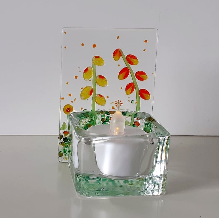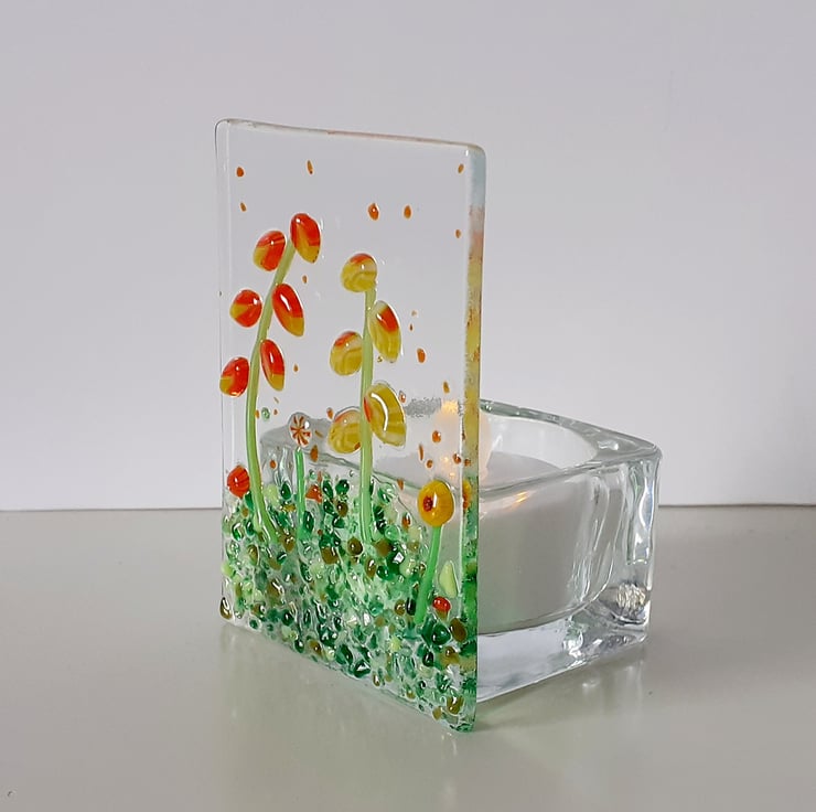 Fused glass panel tealight holder, decorated with a variety of flowers in vibrant shades of yellow and orange, together with a scattering of mixed green foliage. Each panel made in my garden studio is unique.