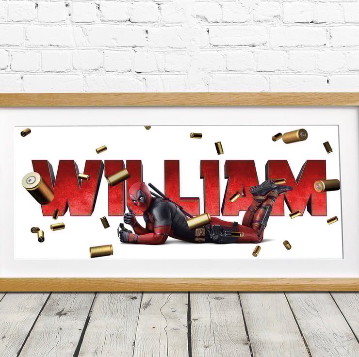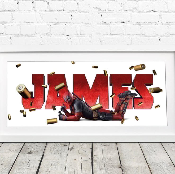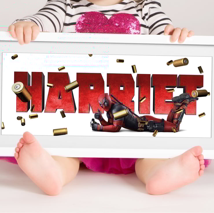 Break the fourth wall (actually, maybe just hang it on your wall instead) with our Deadpool inspired Personalised Framed Name Print featuring the wise-cracking Marvel Superhero. They are perfect for fans of all ages, and make a bright and bold addition to any wall or as part of a themed bedroom design.