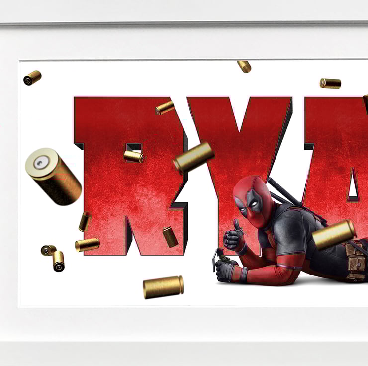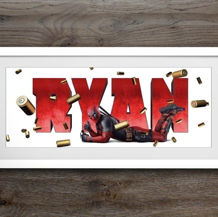 They all feature amazing high resolution 3D type design in the Deadpool style, with the iconic superhero posing in front surrounded by a shower of bullets (classic Deadpool) . They are digitally printed onto thick 350gsm coated satin card, and then carefully trimmed and mounted into a thick white or oak style wooden frame ready to be wrapped in bubblewrap and sent to you.