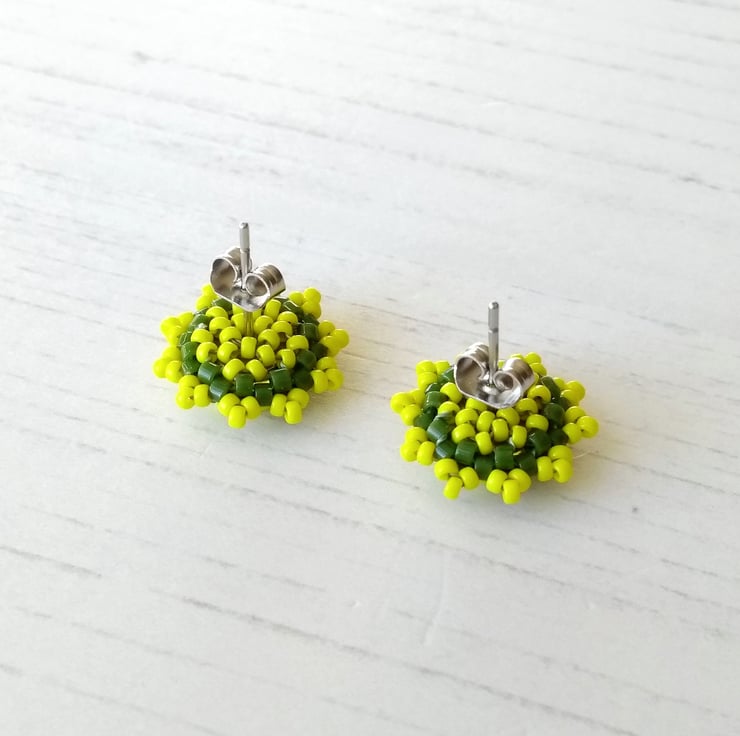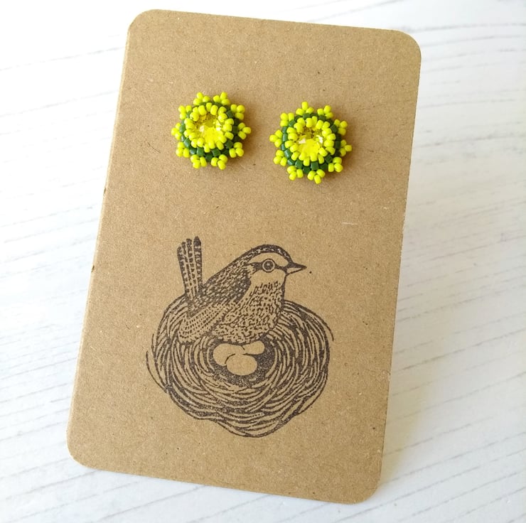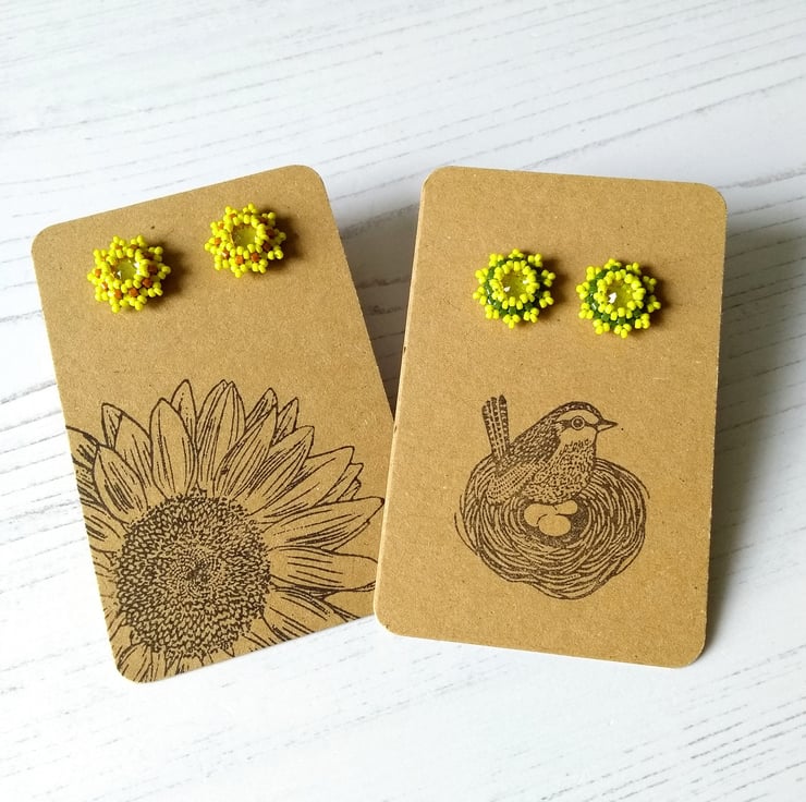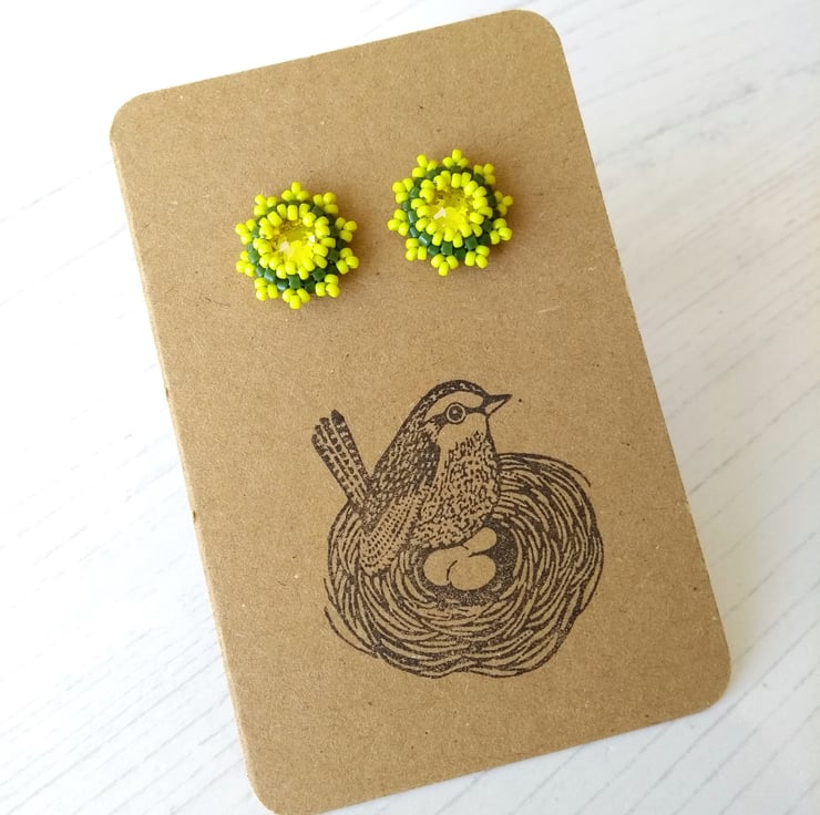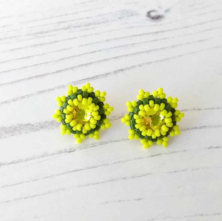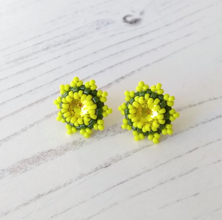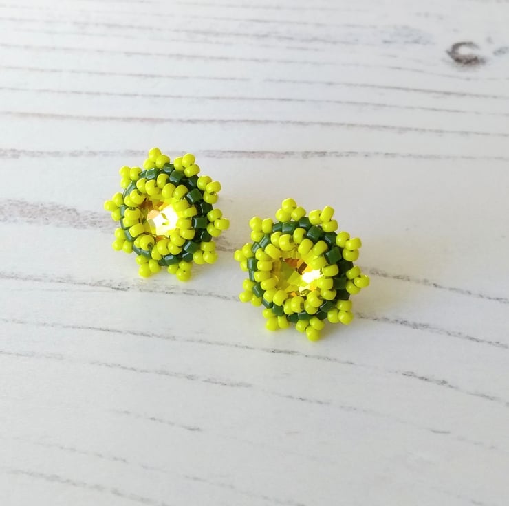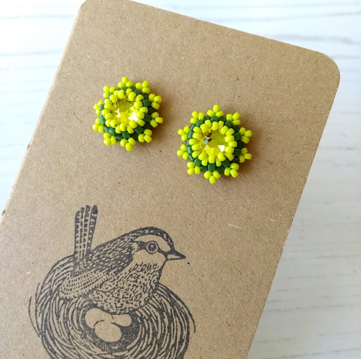 Hand-beaded stud earrings featuring a pretty daffodil yellow crystal chaton surrounded by yellow and dark green seed beads. These earrings are very sparkly and the colour varies depending on which type of light they catch! This pair has been inspired by the daffodils of Spring. This design is also available in sunflower colours - see separate listing.