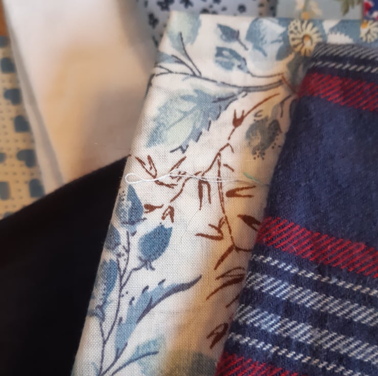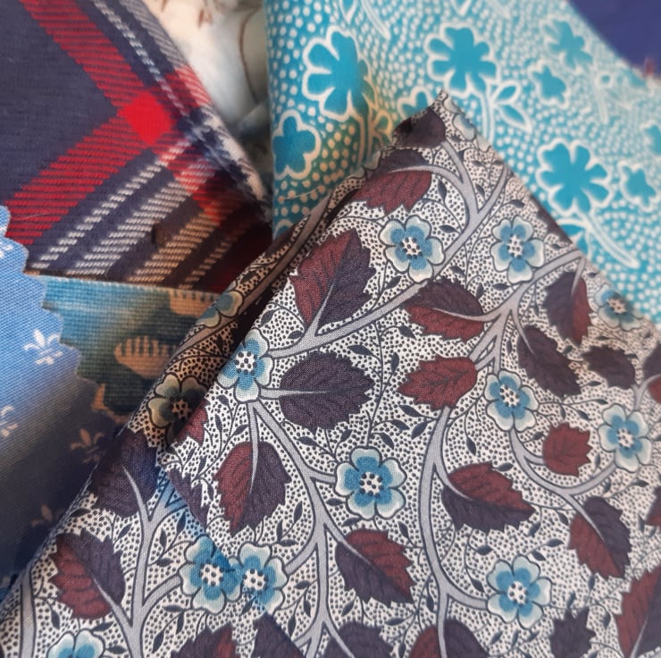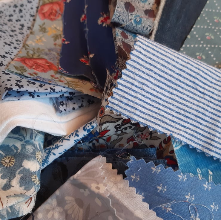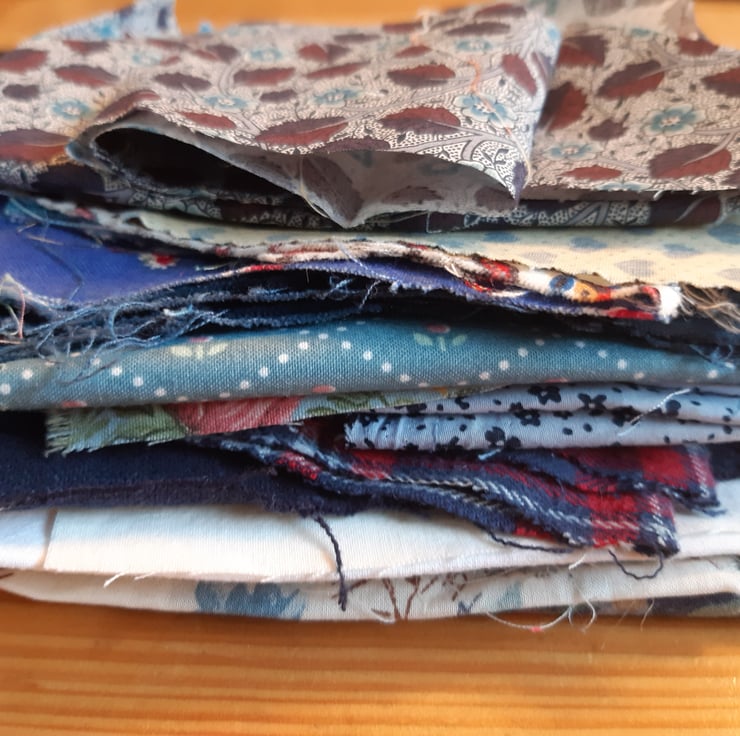 Blue and white - the classic quilt colours. Here's a delightful bundle of approx 20 pieces of cotton fabric in a variety of blues. All shapes and sizes, the largest piece 70cm by 20cm, the smallest 9cm by 7cm. Includes Liberty, vintage and linen.