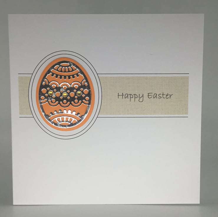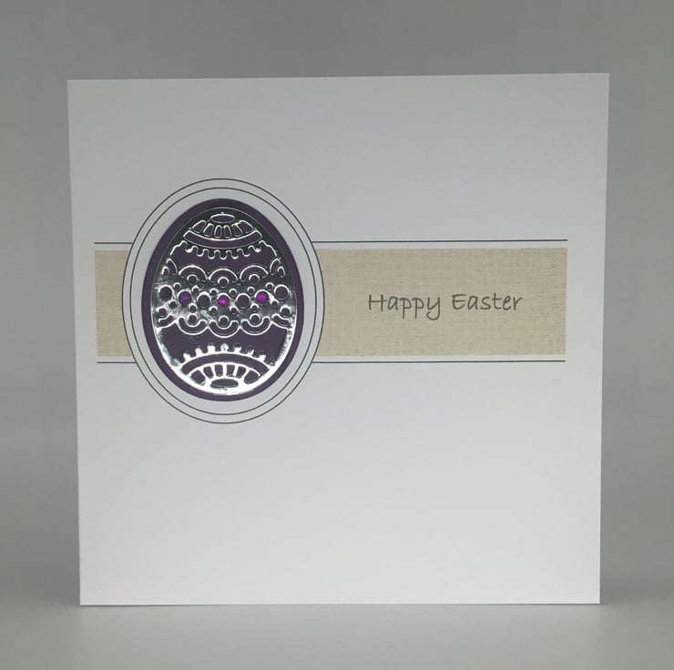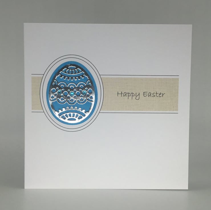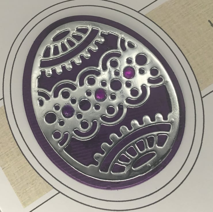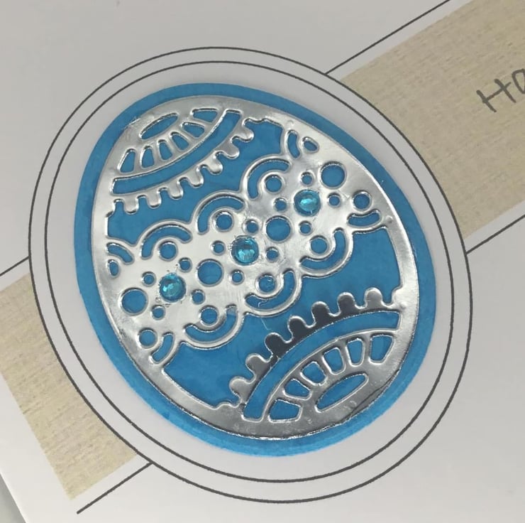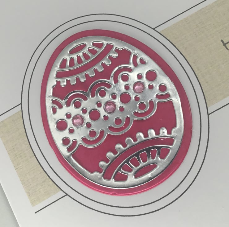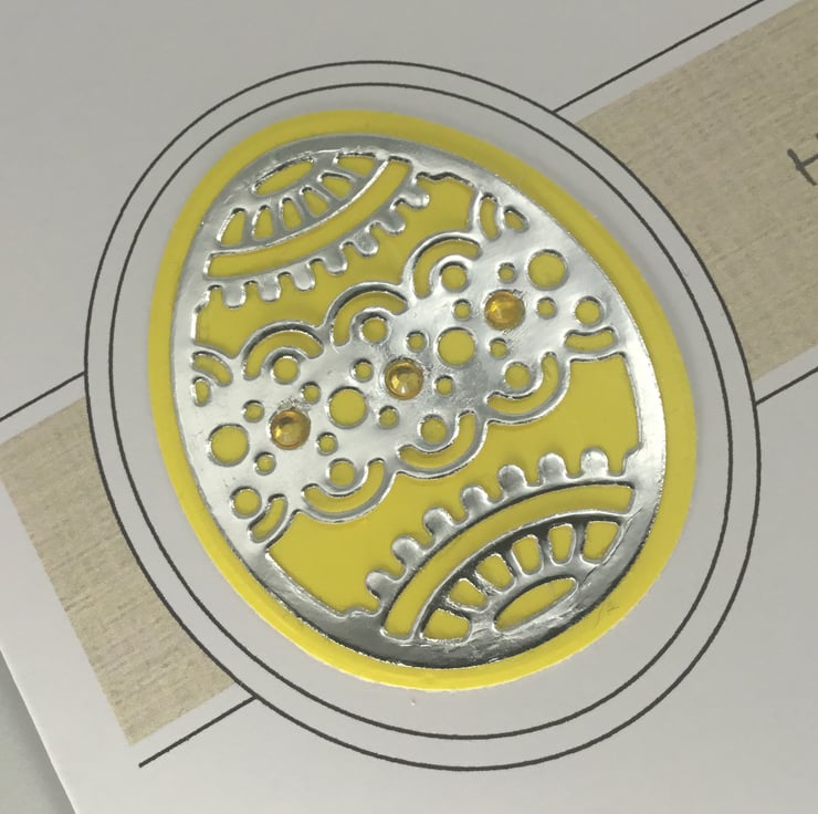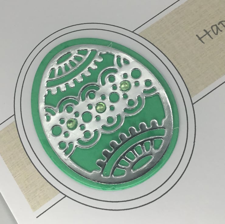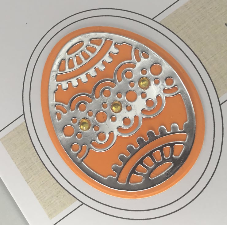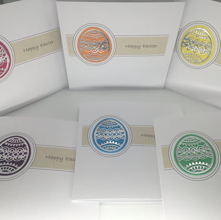 They have been printed on quality, 300gsm card, measuring approximately 15cm, or 6 inch square. The intricate egg design has been cut from mirror paper which had been backed with brightly coloured card. Small adhesive gems have been added to add further detail.
