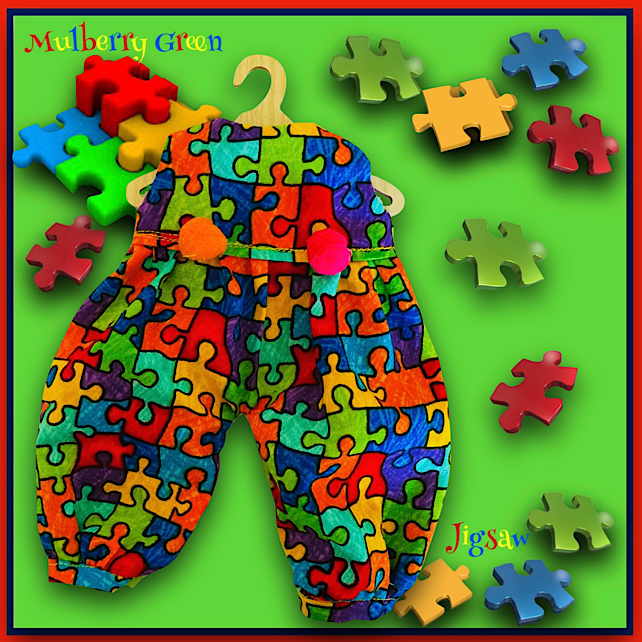 A really cute little playsuit in a jigsaw print fabric to fit the Mulberry Green characters. The playsuit is made from best quality cotton, has gathered legs and a lined bodice. The Playsuit is a bit tricky to put on the doll but looks lovely when it is on.