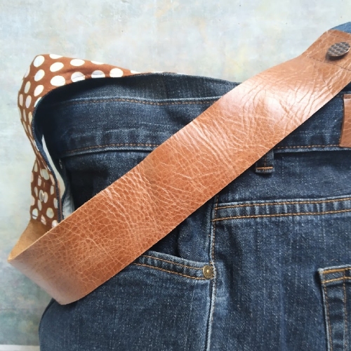 It’s lined with a polka dot cotton poplin in brown with pastel shade dots. The shoulder strap has been made from a soft leather attached to the fabric of the bag with additional jeans button detailing. The leather is 5cm wide and sits comfortably on the shoulder.