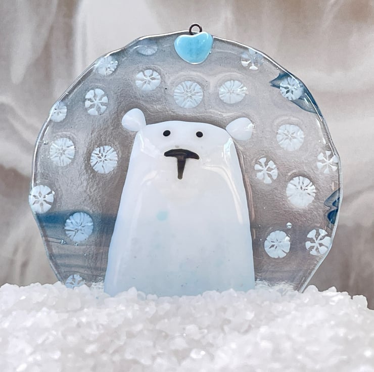 Created from layered Bullseye glass in my Whitstable workshop. This decoration has a beautiful irridescent shimmer and looks gorgeous hanging by a window to show it off.
