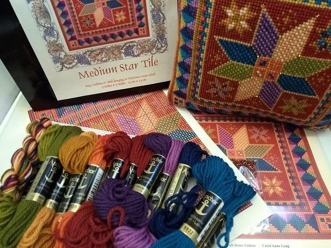 I was commissioned by Woman's Weekly magazine to do a collection of designs for their annual knitting and sewing special edition. I created the Star Tile Cushion and the Medium Star Tile cushion as a pair. These designs include teeny beads for extra sparkle.