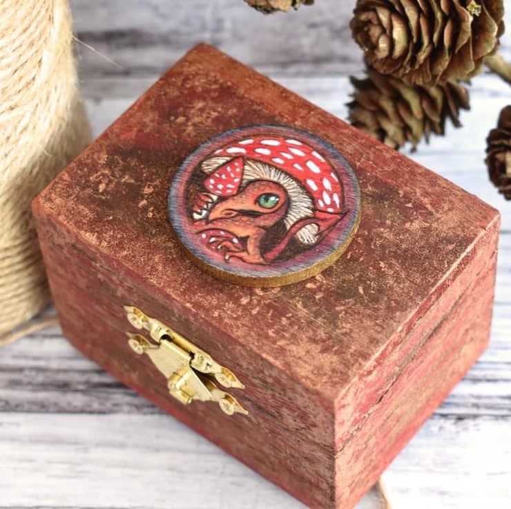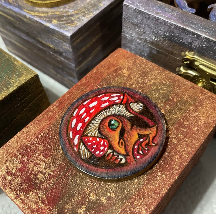 A tiny box featuring a Shroom Dragon. He’s burned by hand using pyrography onto a focal disc and then coloured using art pencils and paint. The disc is fixed to a hand painted box, with metallic accents.