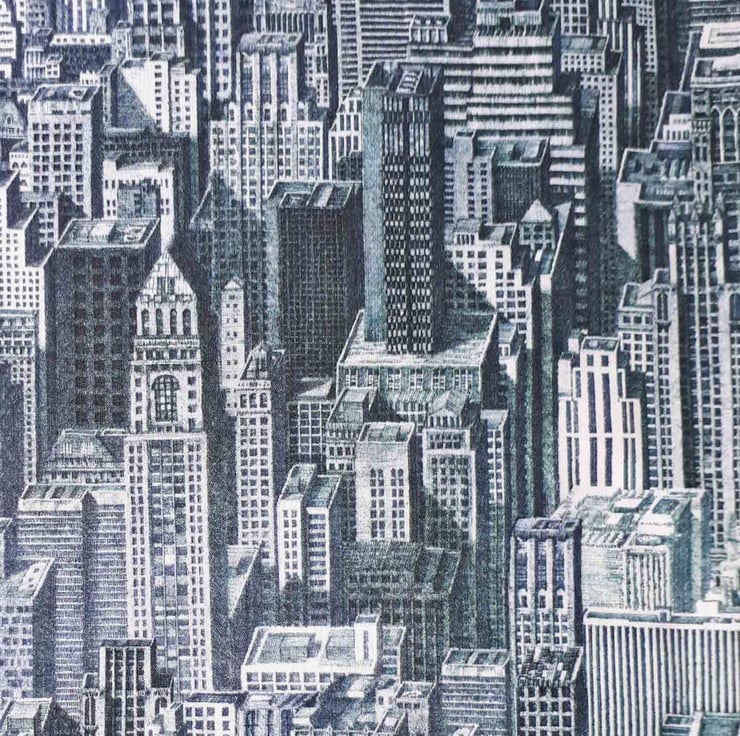 The print is called Harper City and is a highly detailed illustration of a high rise cityscape. As a necklace it gives hints of the geometric patterns found in architecture. Great for lovers of urban form and architecture fans. It is an inky blue/grey colour
