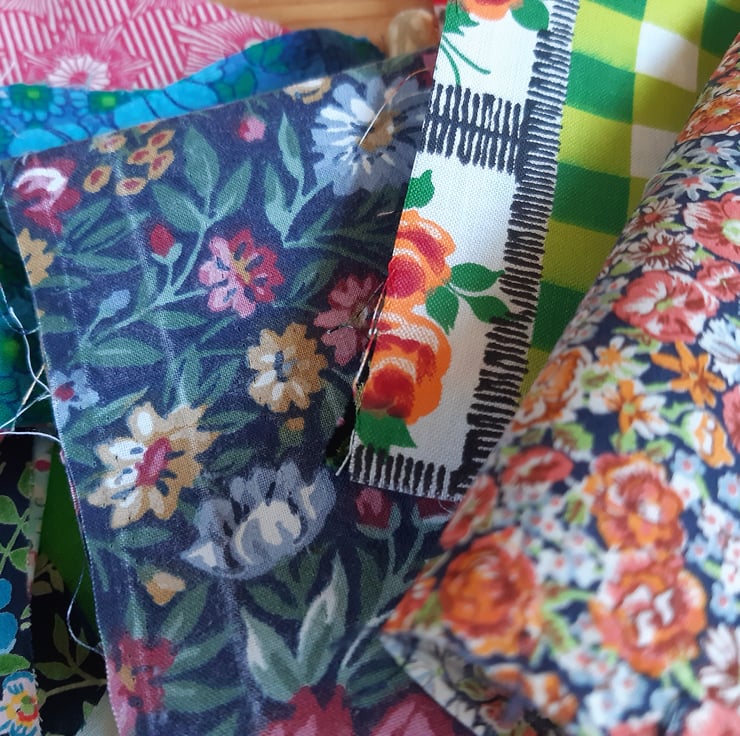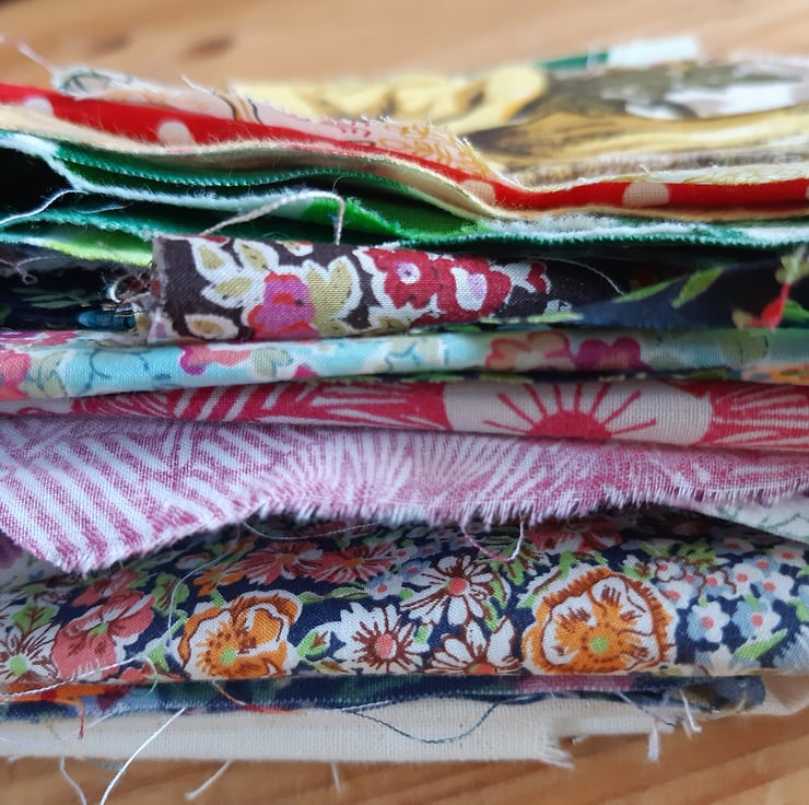 A precious little bundle of largely vintage scraps but with additional liberty pieces, old and new. More than 20 pieces in all shapes, sizes, designs and ages plus a piece of calico to set them off. Biggest piece approx 39cm by 32cm.