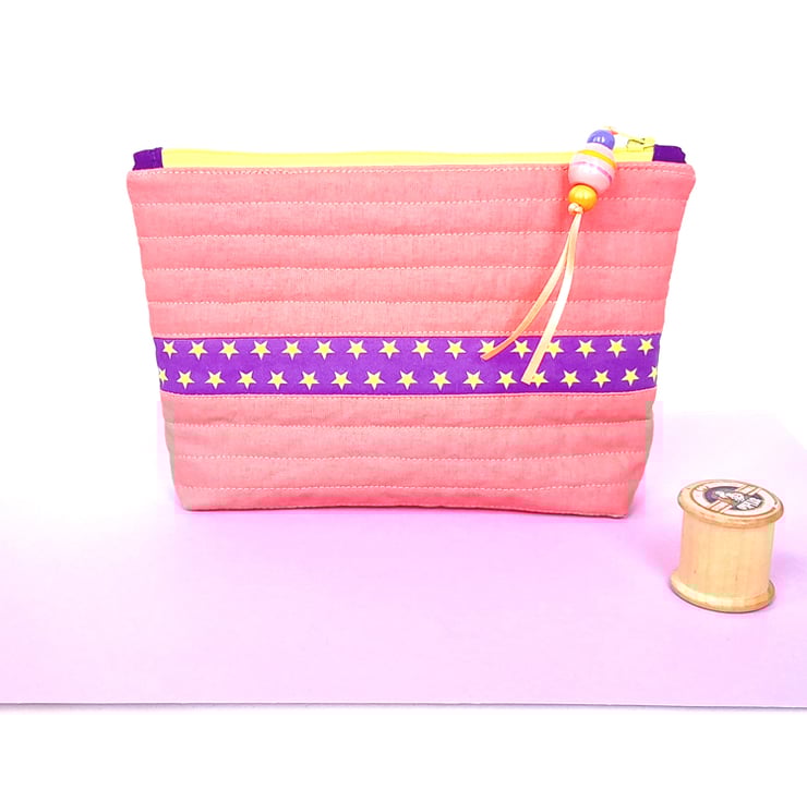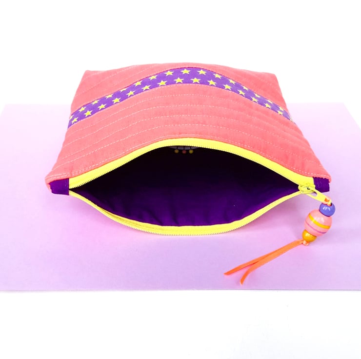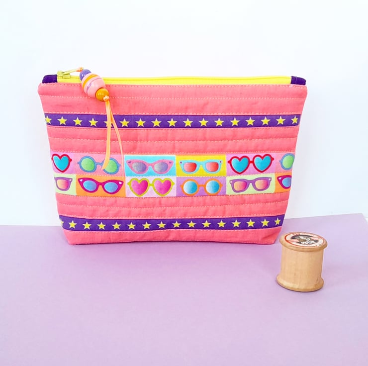 This cute little patchwork quilted zipper pouch has been handmade using plain coral pink 100% cotton fabric and Mini Sunglasses and Stars Forever Purple fabrics from our The Eyes Have It collection on Spoonflower. Unusually both the front and back of the pouch have a patchwork design, it has a purple cotton lining and some matching wooden buttons have been attached to the zip pull,