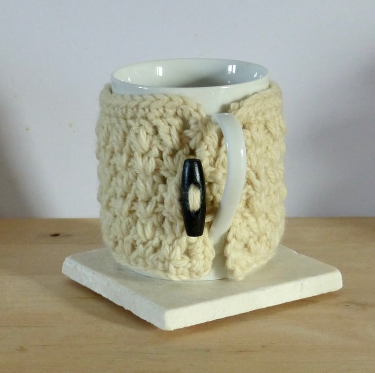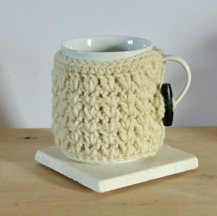 A crocheted Mug Cosy in a traditional arran yarn which is 100% wood. It measures approximately 25cm long by 9cm wide so should fit most standard mugs. Just wrap it around and fasten with the crocheted loop and dark wood toggle button. An ideal gift for a tea or coffee lover.