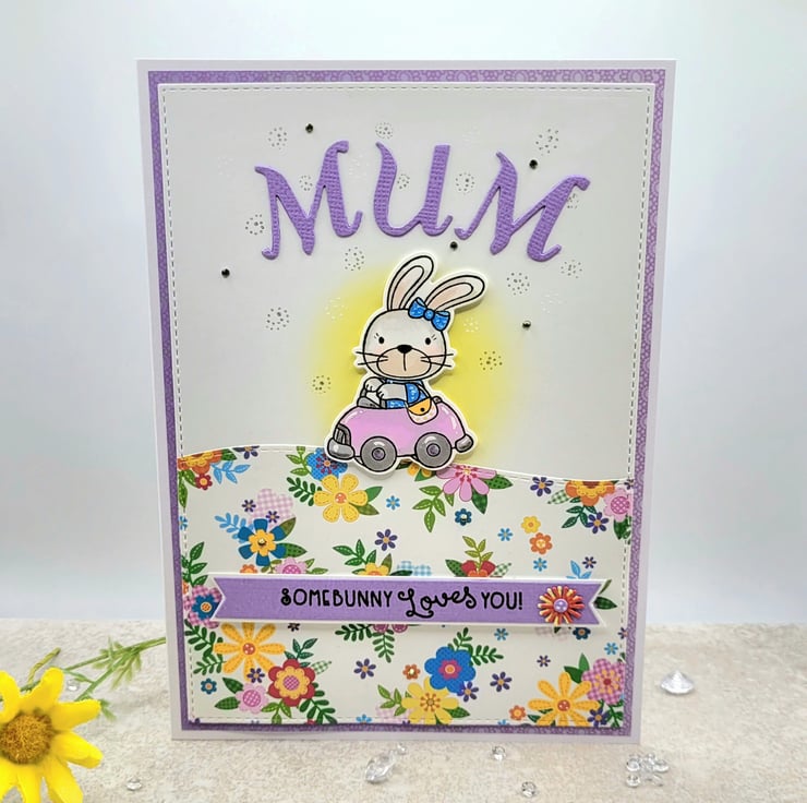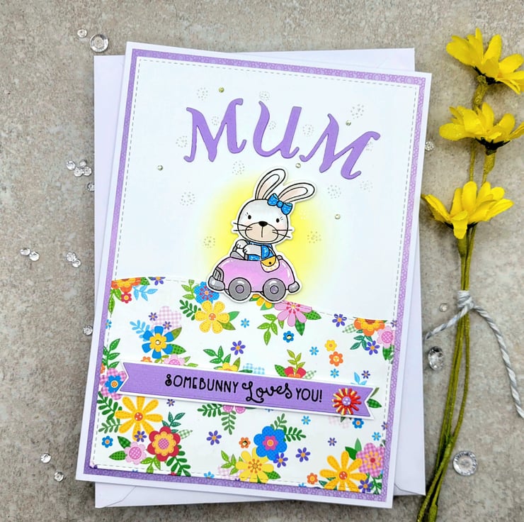 A mum birthday card. A cute card that can also be for Mother's Day, with a cartoon style bunny and car. This one of a kind card is guaranteed to bring a smile to a special Mum's face!!