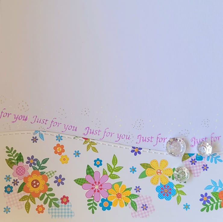 There is a tiny stamping flaw on the inside, one of the hand-stamped 'Just for You' sentiments is slightly darker and a fraction out of alignment. This does not detract from the card in any way and is barely noticeable, if anything it adds to the true handcrafted nature! However I've greatly reduced the price because of this.