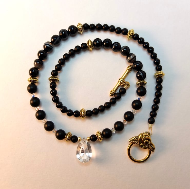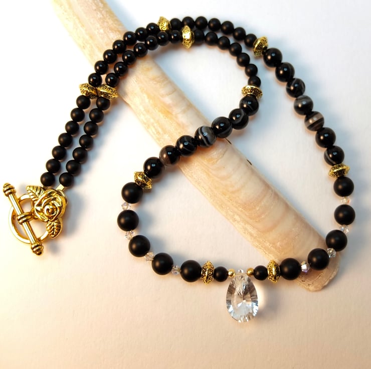 Stylish black-and-gold necklace with sparkly Swarovski crystals and a teardrop of crystal quartz.