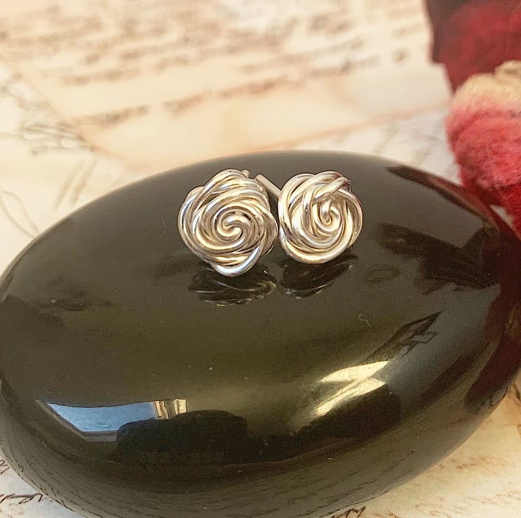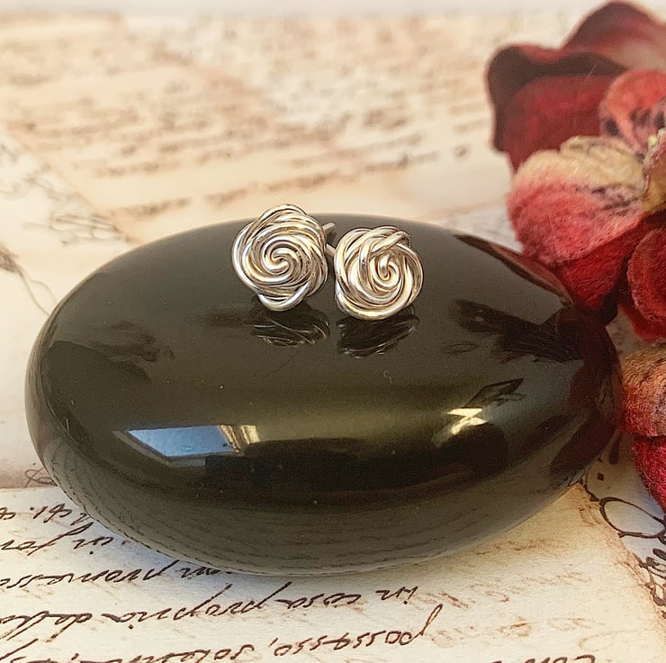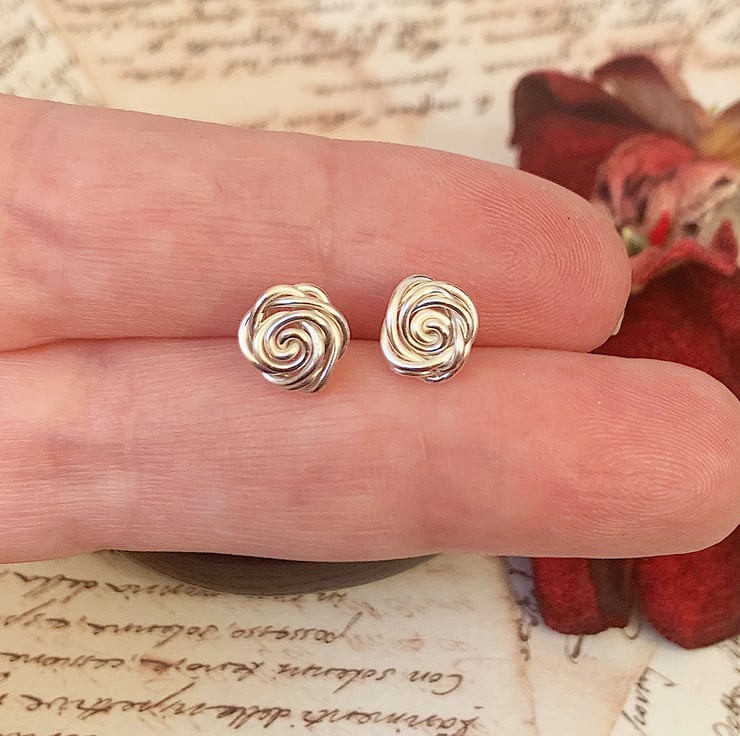 Handmade rose stud earrings in silver coloured copper wire.