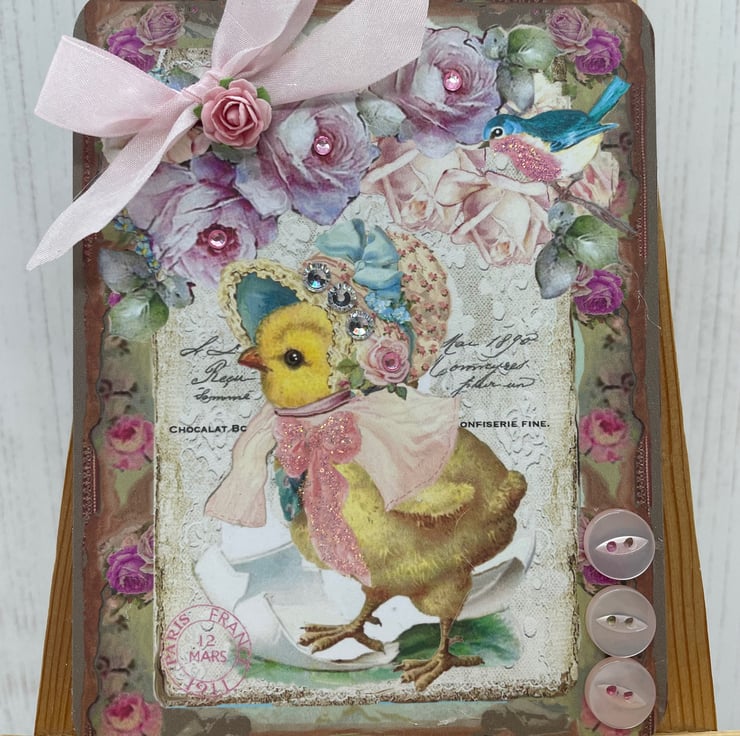 Vintage style chick tag, mounted onto pink card with faux rose stamp on the back. Faux silk ribbon with a paper rose, diamantés, pink gems, glitter and buttons to embellish.