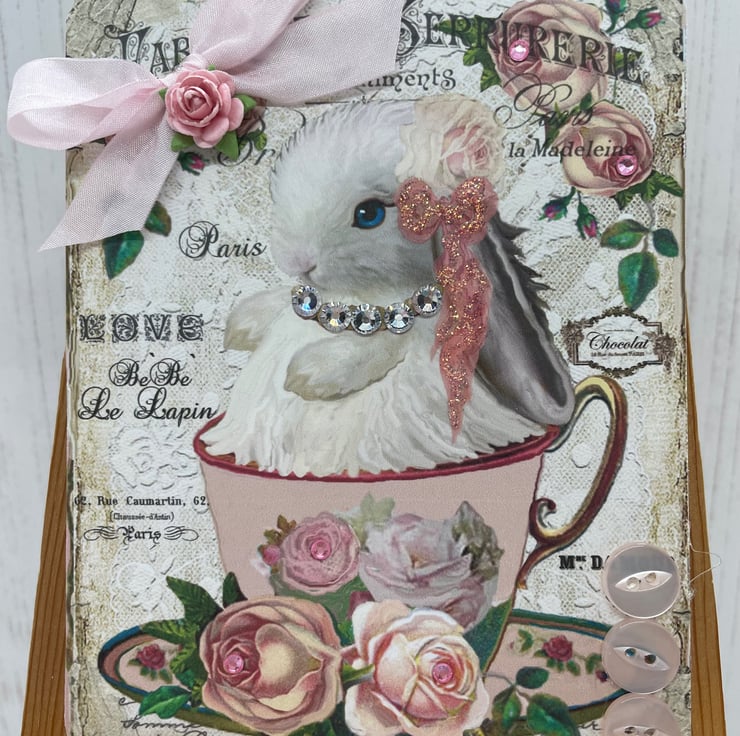 Vintage style bunny tag, mounted onto pink card with faux rose stamp on the back. Faux silk ribbon with a paper rose, diamantés, pink gems, glitter and buttons to embellish.