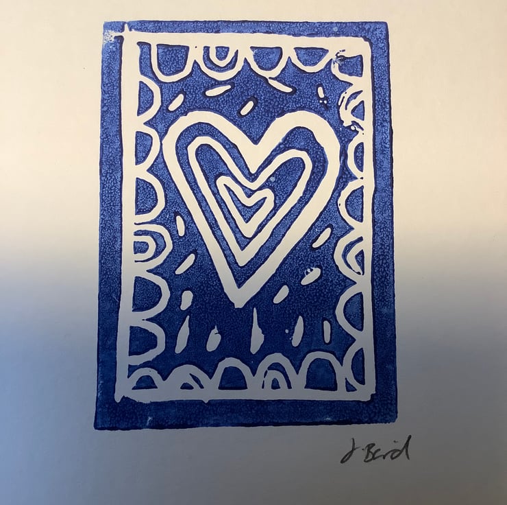 This is an original lino print. Printed in blue ink and measuring approximately 8x10cm. There are two variations to pick from. Please specify which one you’d like when ordering.