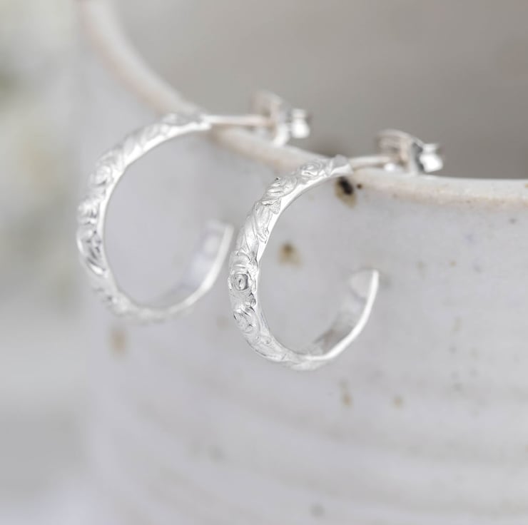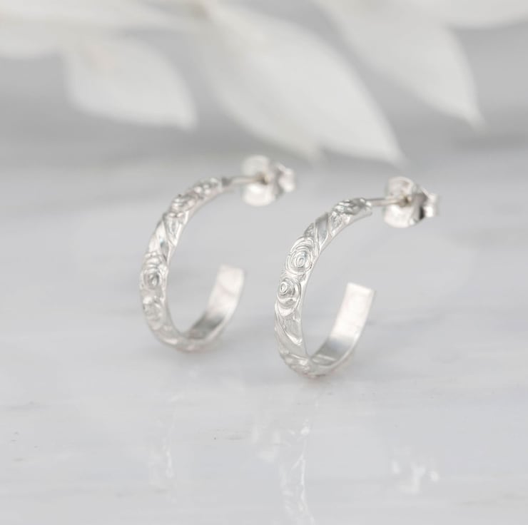 Made from sterling silver with a swirly, flowery design, these are hoops with a post, and scroll or butterfly backs to keep them on rather than full hoops. So you get the look of a hoop, but with the stud fixture.