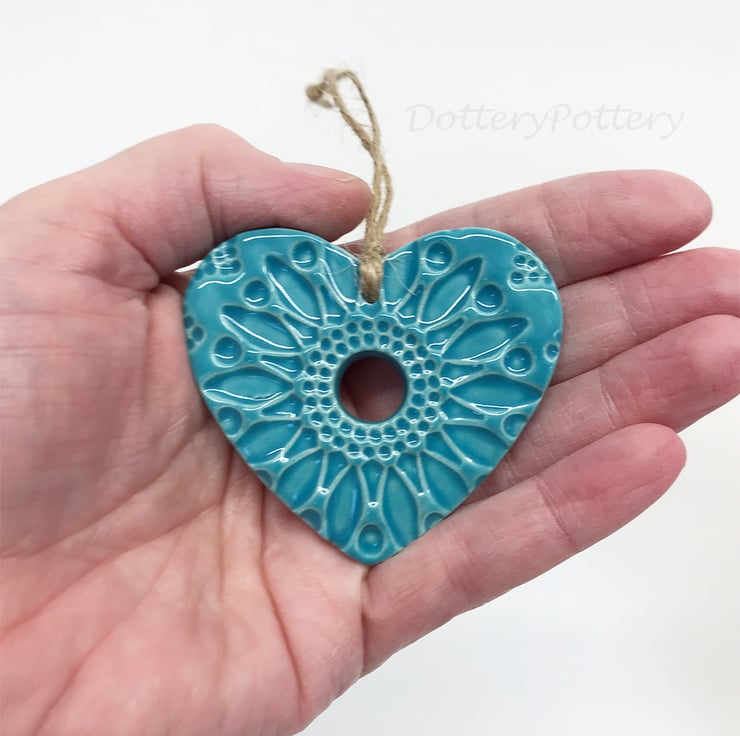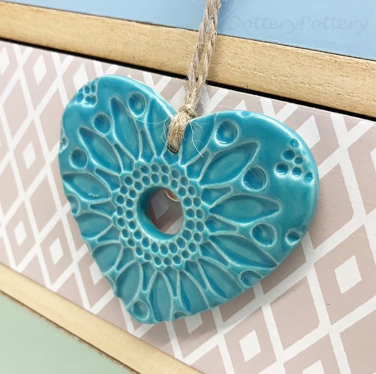 This little heart is made from white earthenware clay, imprinted with pattern and finished with a bright, glossy glaze. It has been fired twice, once to the bisque stage and then a second firing for the glaze. It measures 6 centimetres wide x 5.5cm height x 5mm thick. It can be hung outside.