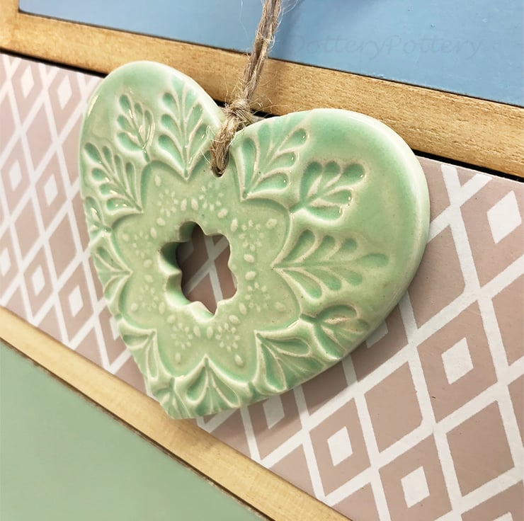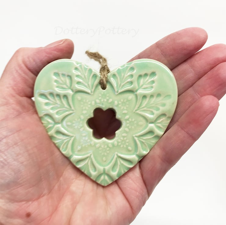 This listing is for a ceramic heart decoration. It is made from white earthenware clay, imprinted with pattern and finished with a bright, glossy glaze. It has been fired twice, once to the bisque stage and then a second firing for the glaze. It measures 7.5 centimetres wide and the same in height x 5mm thick. It can be hung outside.