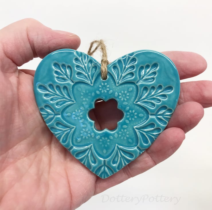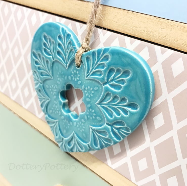 Ceramic heart hanging decoration Pottery Heart Folk art love heart aqua
