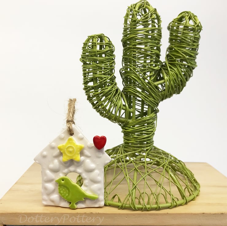 This little bird house decoration is made from white earthenware clay and finshed with a little star and a bright bird. It has been fired twice and finished with a glossy glaze for a lovely smooth finish. It measures 7.5 x 7cm and hangs from rustic brown string
