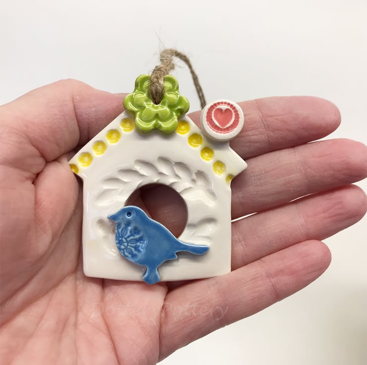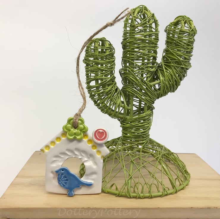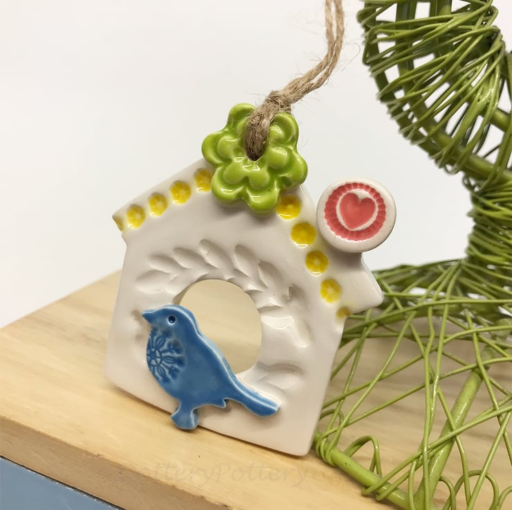 This little bird house decoration is made from white earthenware clay and finshed with a little star and a bright bird. It has been fired twice and finished with a glossy glaze for a lovely smooth finish. It measures 7.5 x 7cm and hangs from rustic brown string