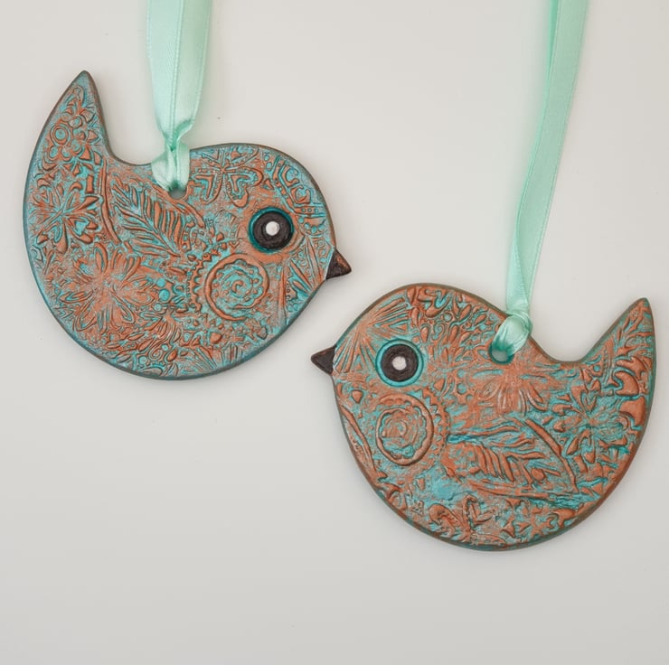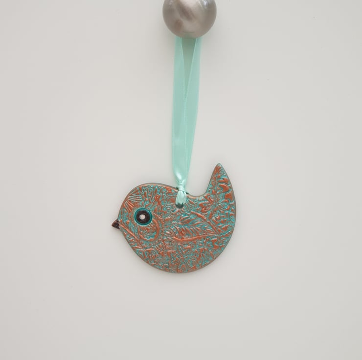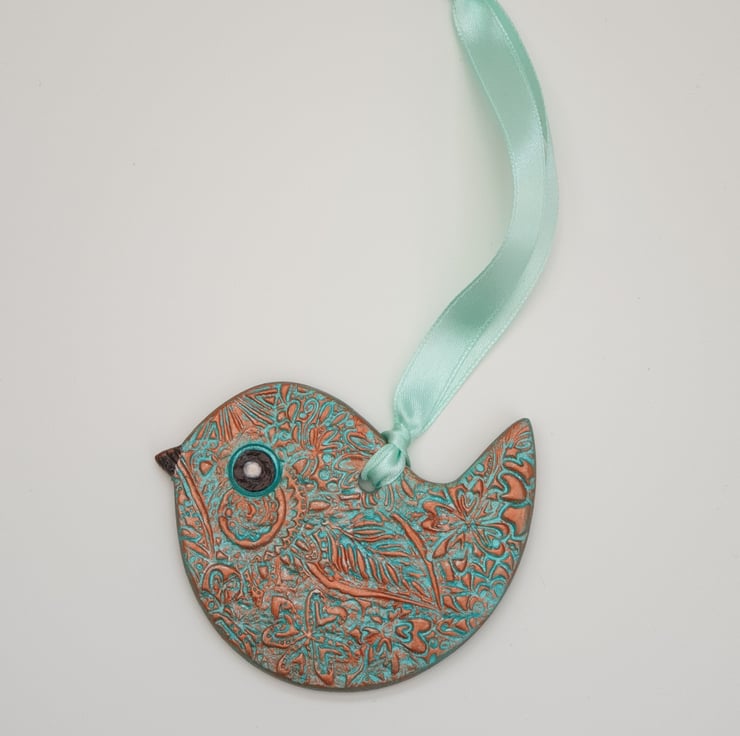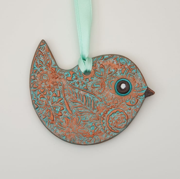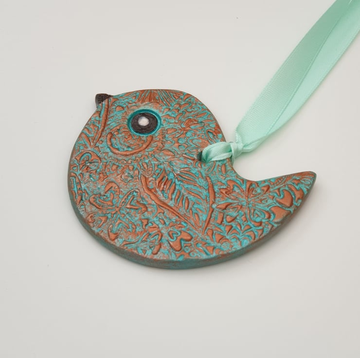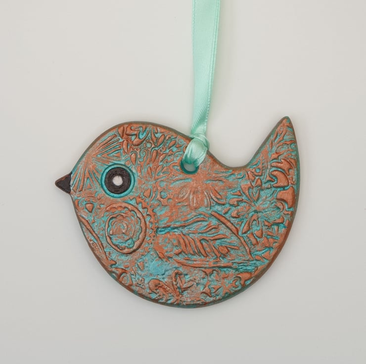 Very pretty sea green and copper coloured clay bird which has been lovingly created from air dry clay. Both sides of the bird have been decoratively textured with a floral pattern, painted with acrylics and varnished for protection. This sweet bird comes ready to hang with satin ribbon and would look lovely in a window or hung from a handle or cupboard, etc . This little bird would make a wonderful addition to your home decor or a lovely gift and comes supplied in a pretty organza bag finished with ribbon.