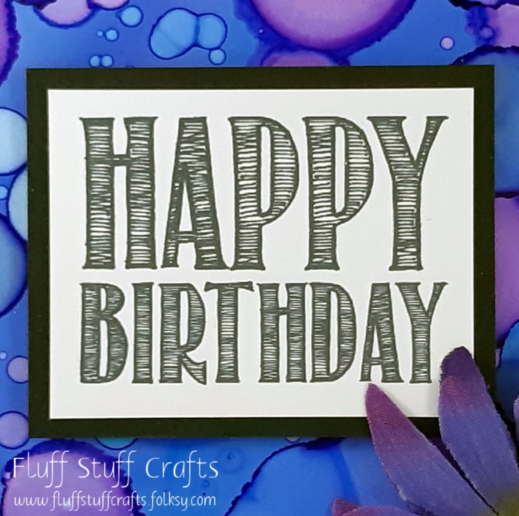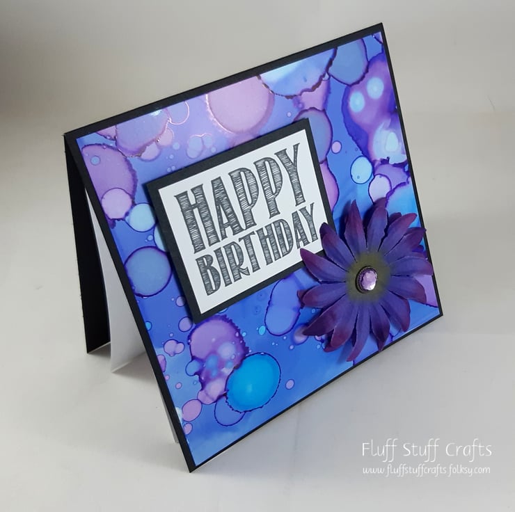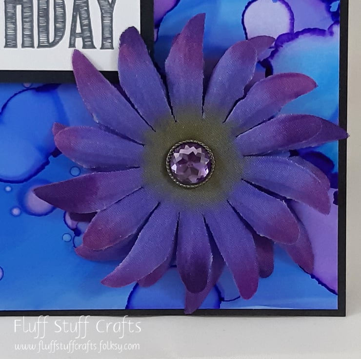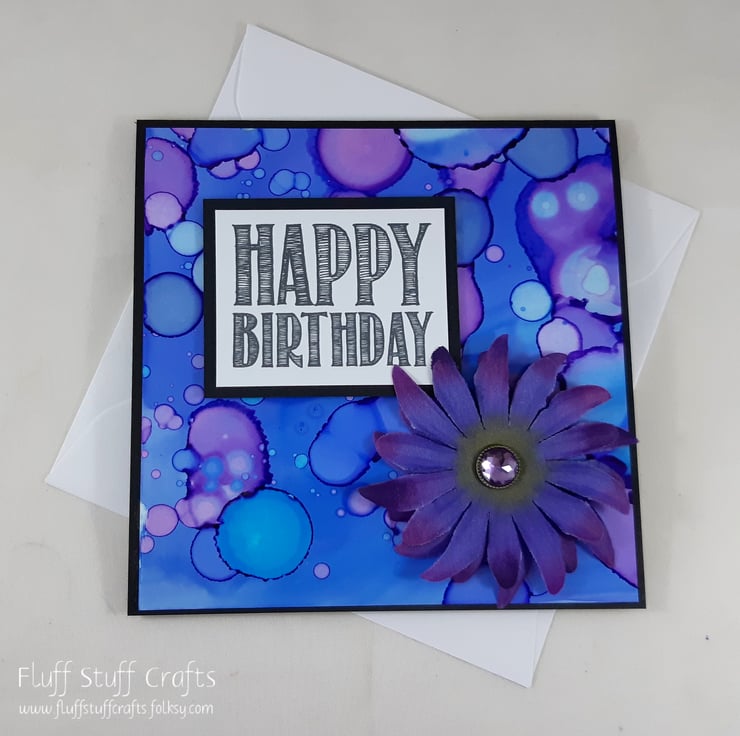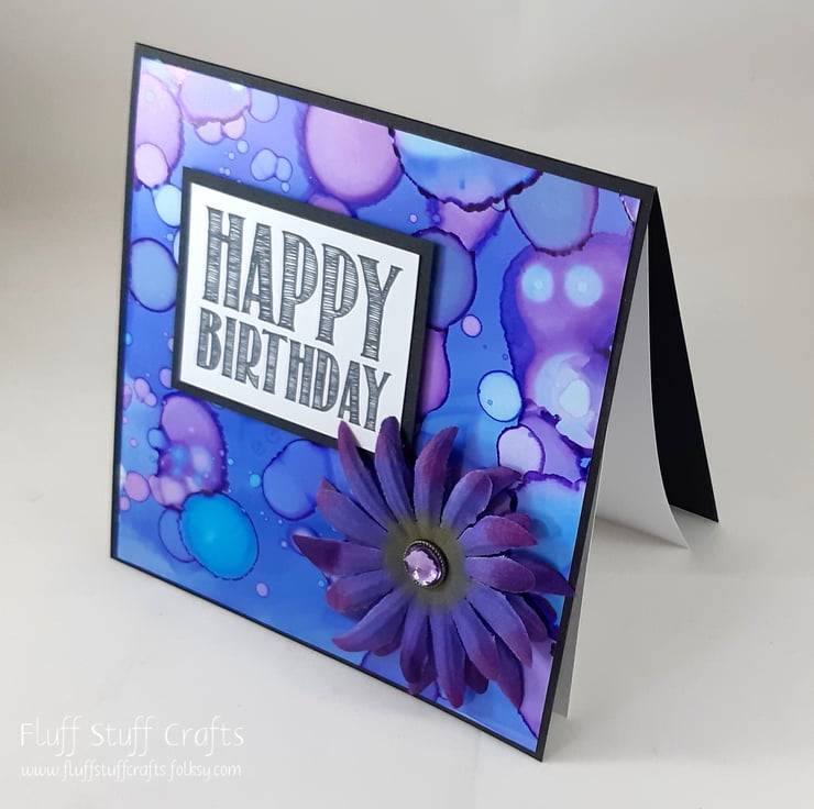 Square birthday card, in shades of blue and purple, created using alcohol inks on synthetic paper. The sentiment 'Happy Birthday' is overlaid onto the background and mounted on black card. The card is embellished with purple/blue fabric flowers with a faceted gem brad in the centre.