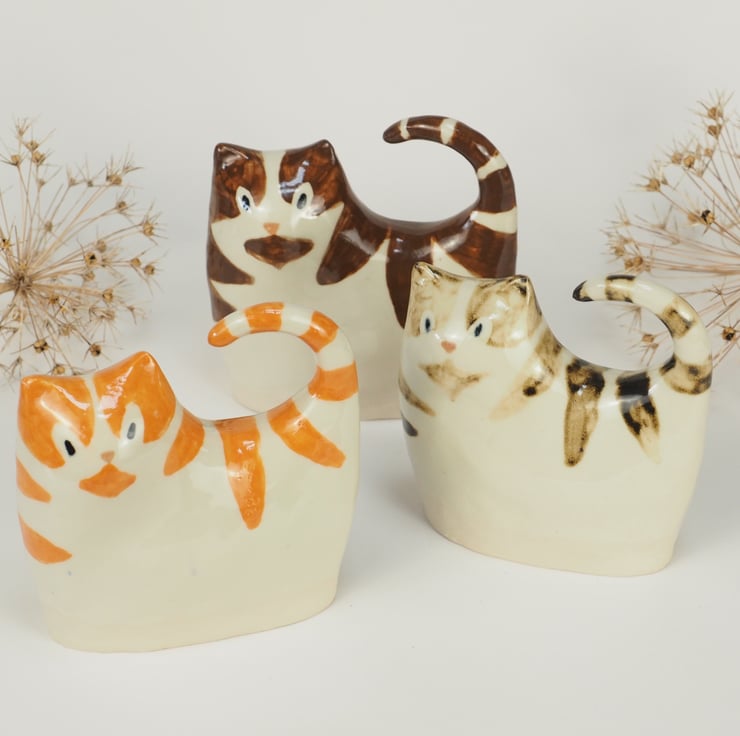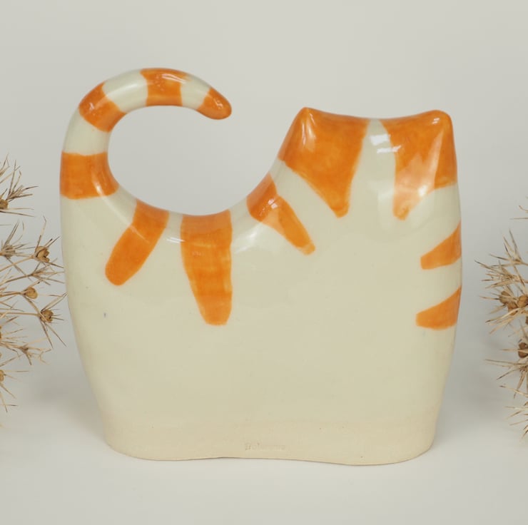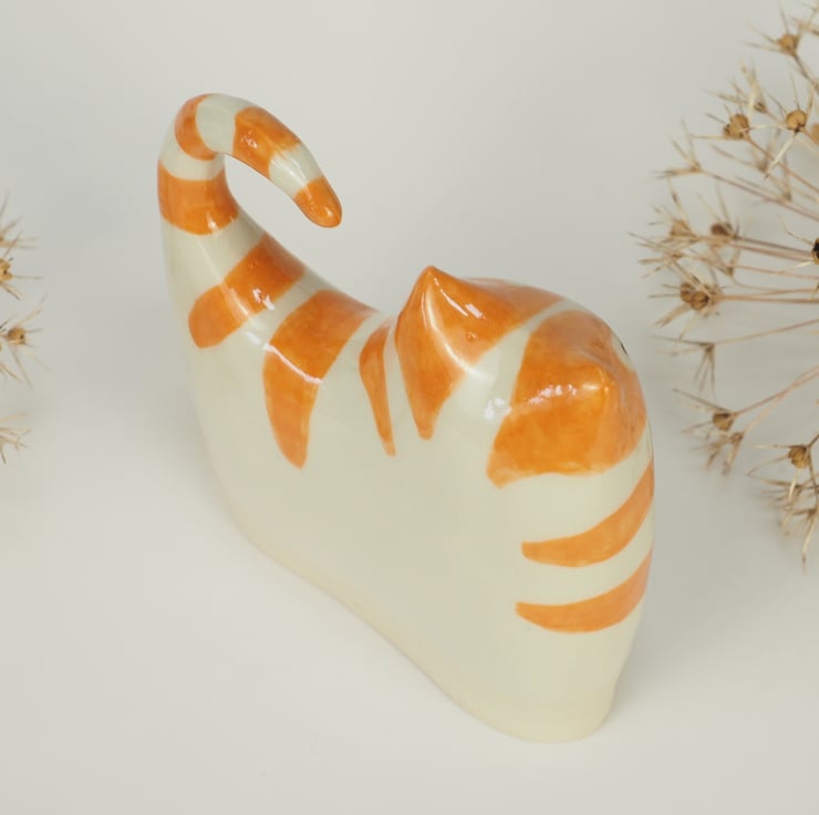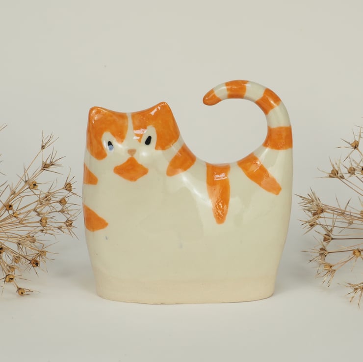 A cute ceramic kitten that has been hand cast from my own clay original and a handmade plaster mould. It is then dried, fired in the kiln, hand painted, finished in glossy transparent glaze and fired again. This one has got ginger stripes!