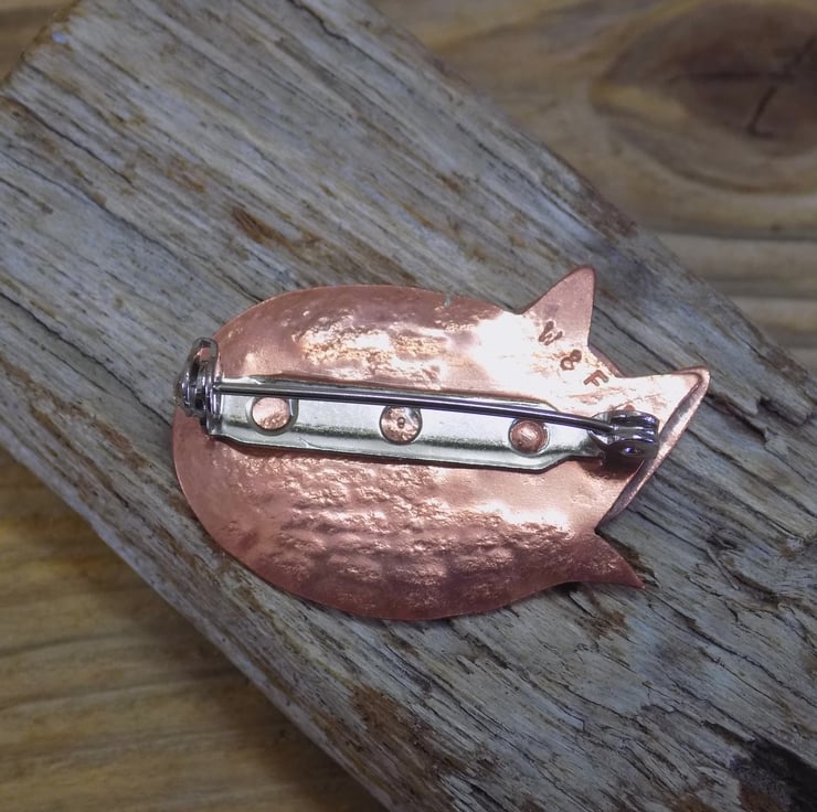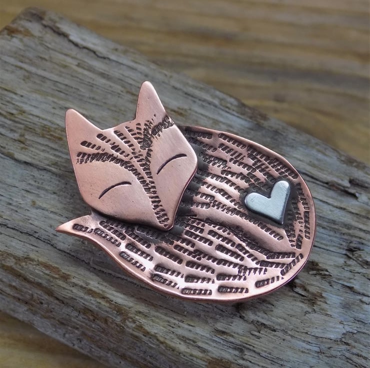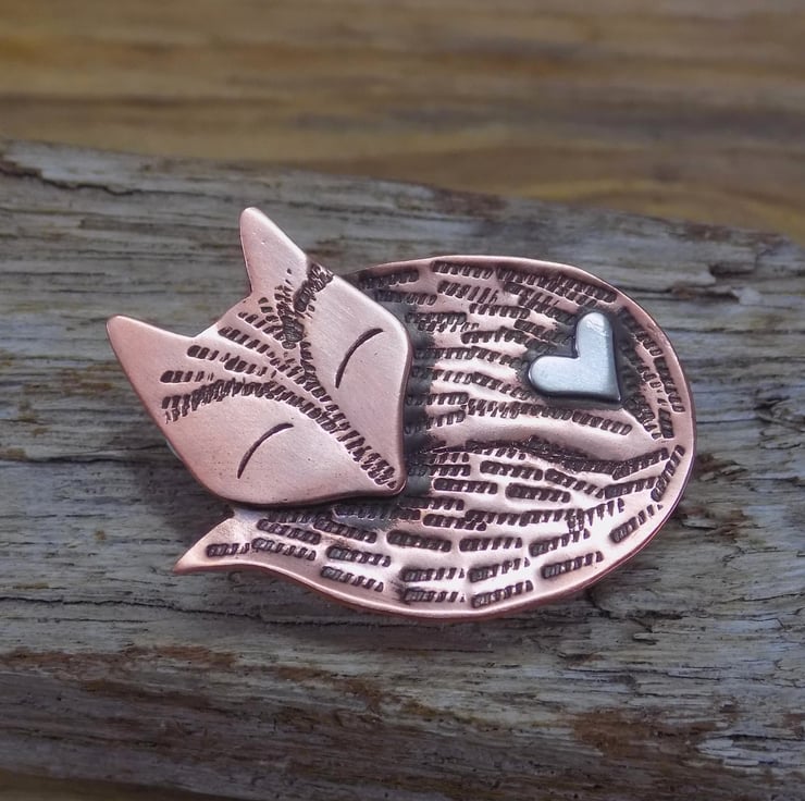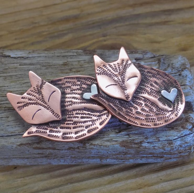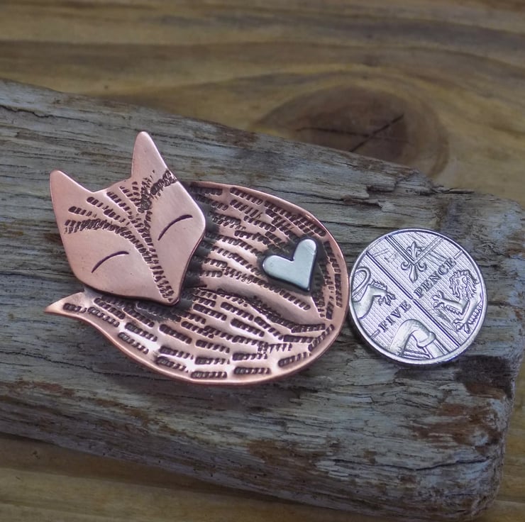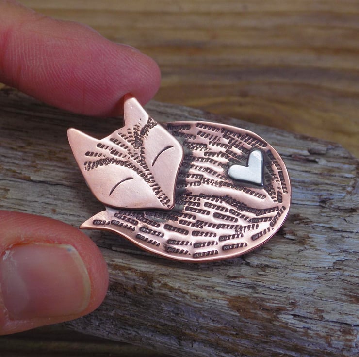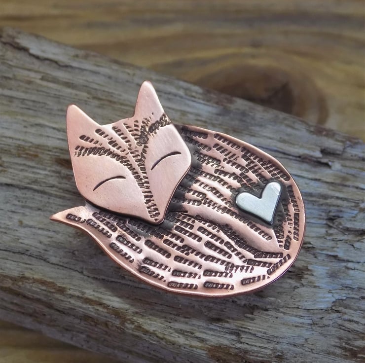 A sleeping fox brooch made from copper sheet and sterling silver. All hand sawn, filed and polished to give a smooth finish. The head has been soldered on separately to give a slight 3d effect, and his body has been textured with individual punch marks to create his coat. A sterling silver heart has been added to make it extra special. Attached to a safety clasp brooch back with strong jewellers glue.