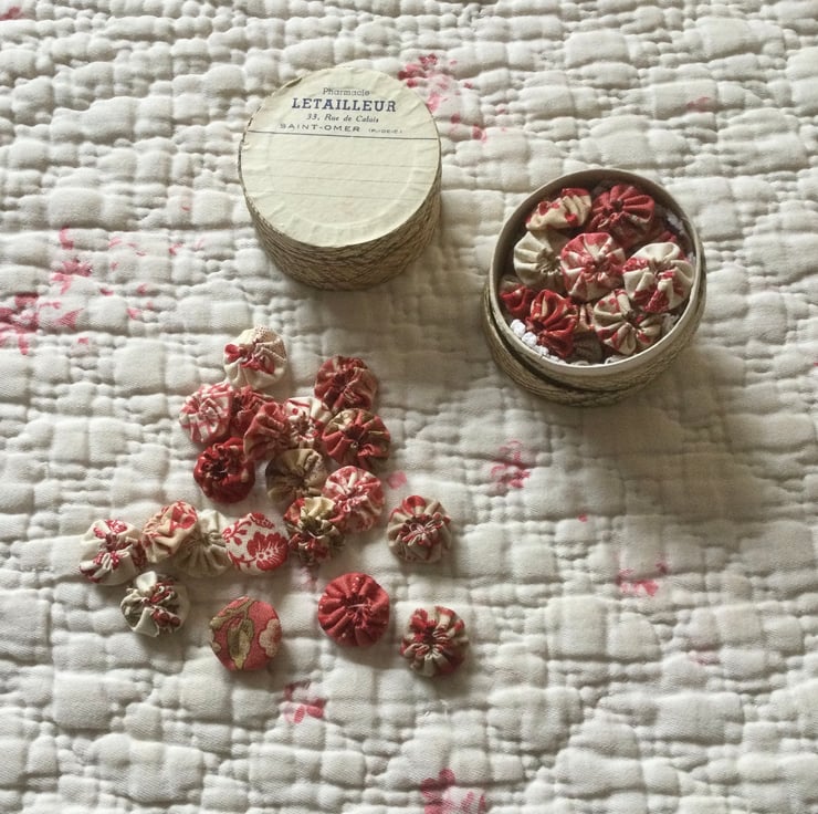 A mini French vintage ‘pharmacie’, circular cardboard box, filled with 20 handmade Suffolk puffs (fabric yoyo’s), in a variety of coordinating shades by French General for Moda, ‘La Rose Rouge’.