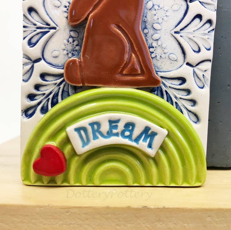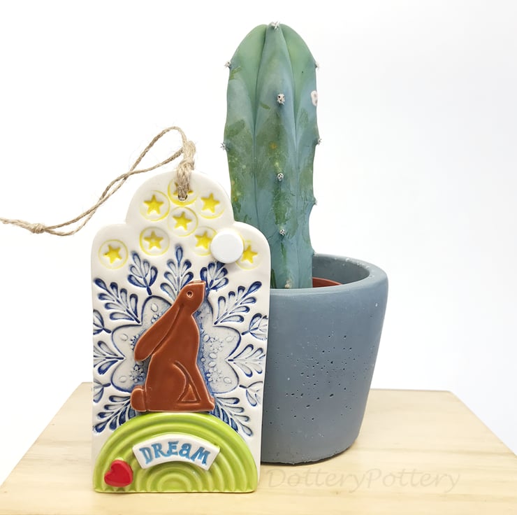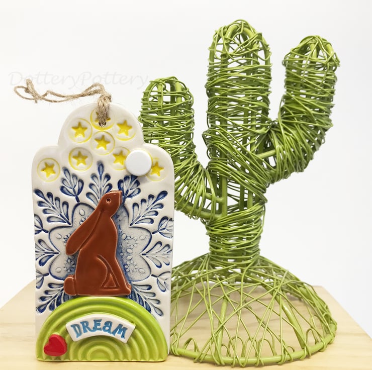This tag decoration has been made from white earthenware clay. It combines imprinted pattern and raised decorative elements. The tag shape has been hand cut from my own termplate and the little moongazing hare is from my own design too. It has been finished wth a glossy clear glaze and fired to 1100 degrees. It measures 6cm wide x 11cm high x 1cm deep.
