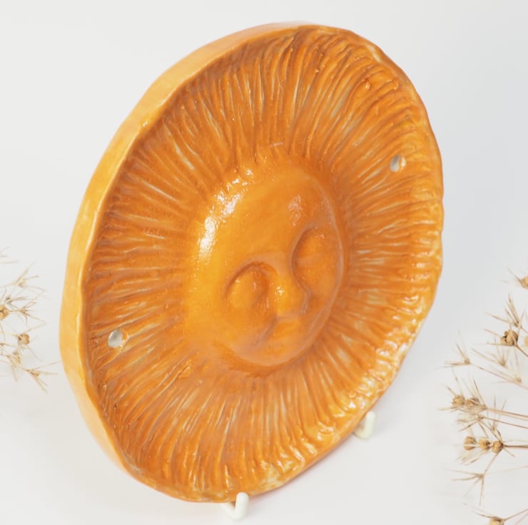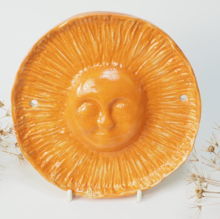 I mainly work with stoneware clay, which is naturally frostproof when fully fired so I wanted to expand my range of products for the garden. The result was these cheery sun plaques which can be fixed to a wall inside or out