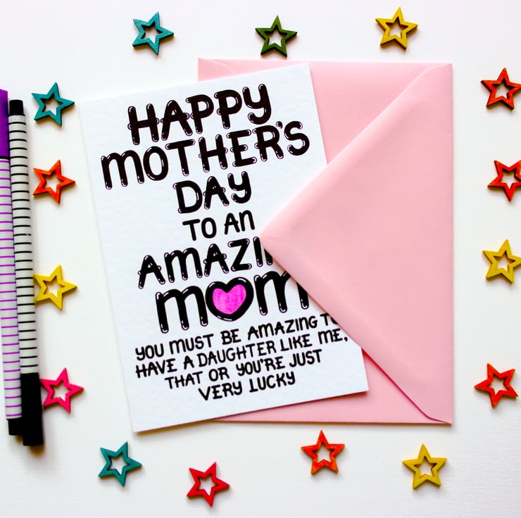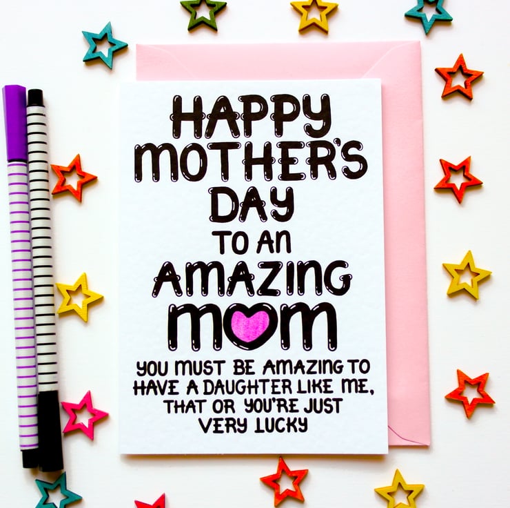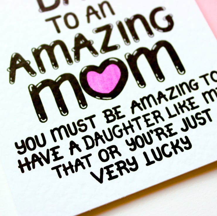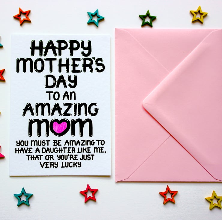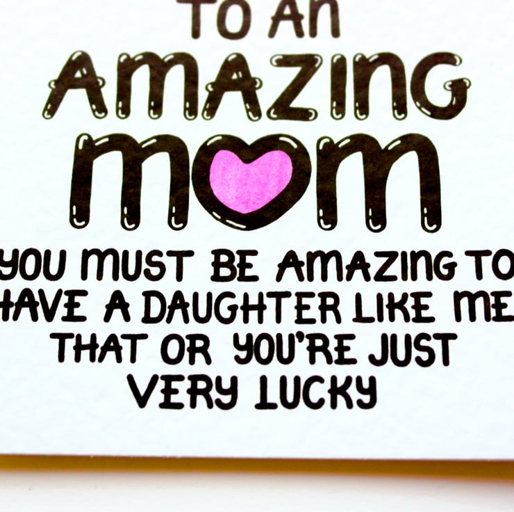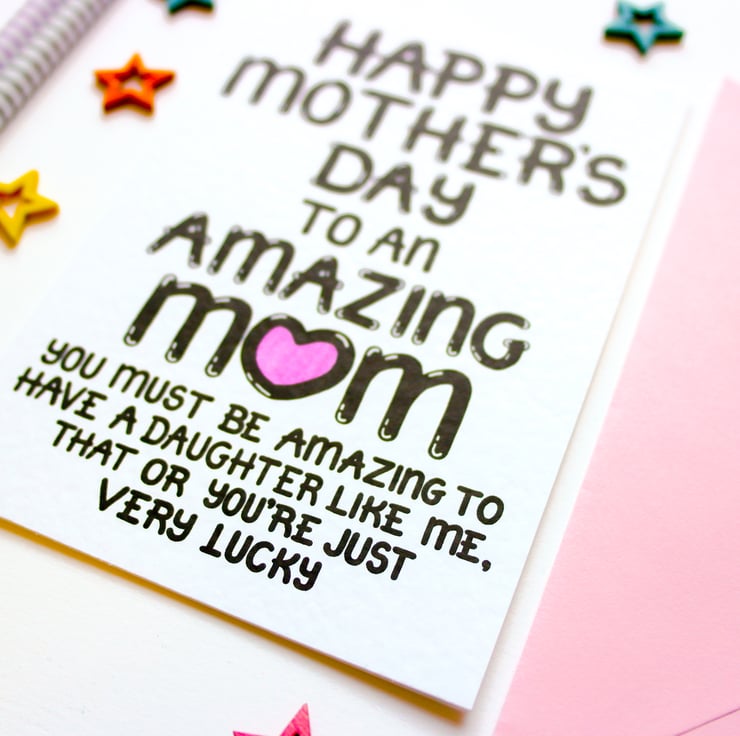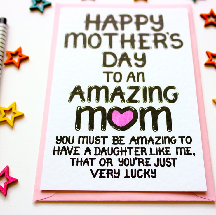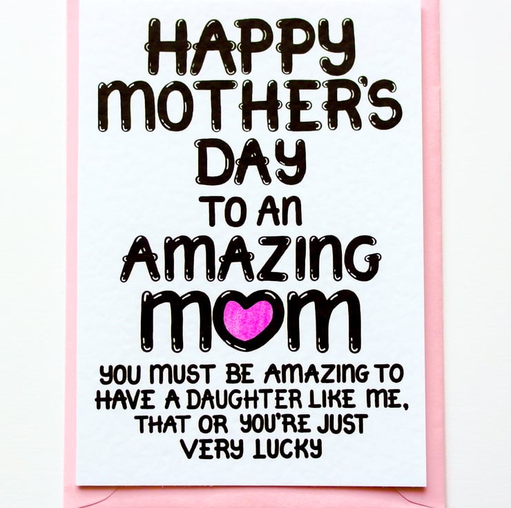 Greeting on front: HAPPY MOTHER'S DAY TO AN AMAZING MUM YOU MUST BE AMAZING TO HAVE A DAUGHTER LIKE ME, THAT OR YOUR JUST VERY LUCKY