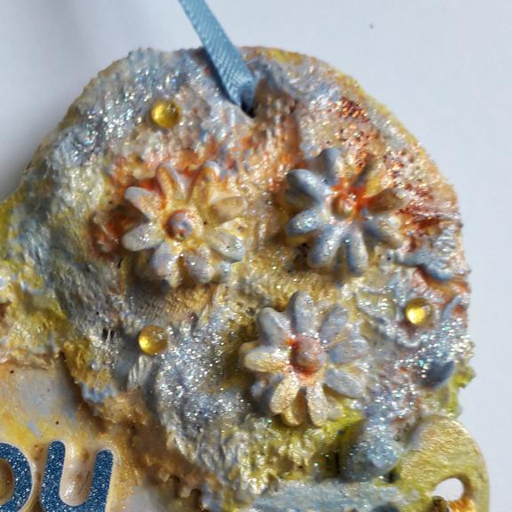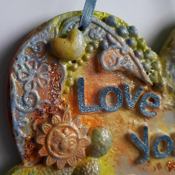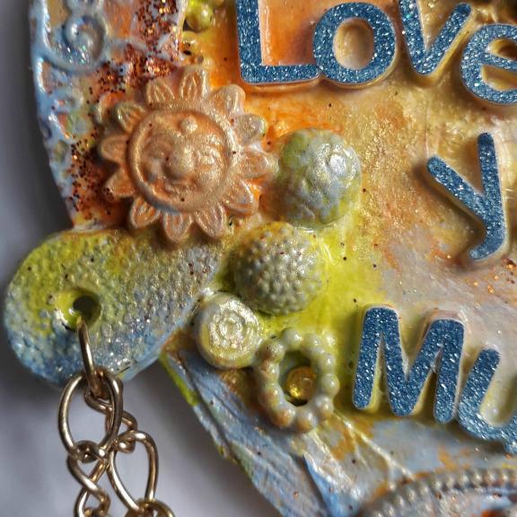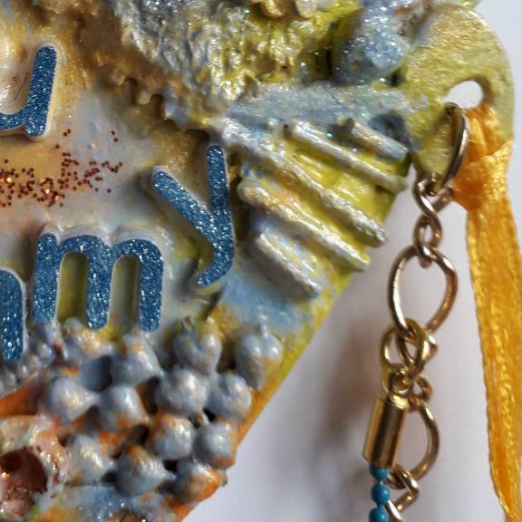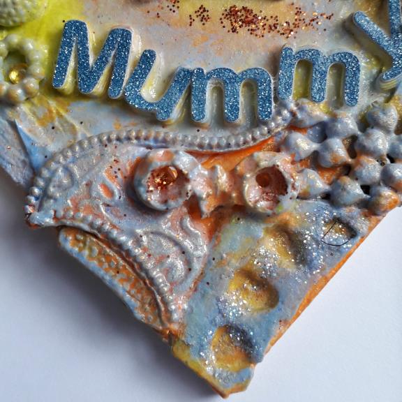 I have used various upcycled bits and pieces to decorate this 10cm mdf heart for "Mummy", including broken jewellery, charms, lace, buttons, clay. and parts of a zip, I have also added some gems and glitter.