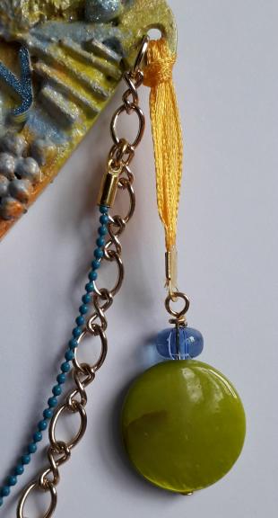 Attached to the heart is a gold tone fancy chain and a blue ball chain with a green glass barrel bead with pieces of blue diamante trim to one side and a green disc bead and blue glass bead suspended from orange ribbon on the other.