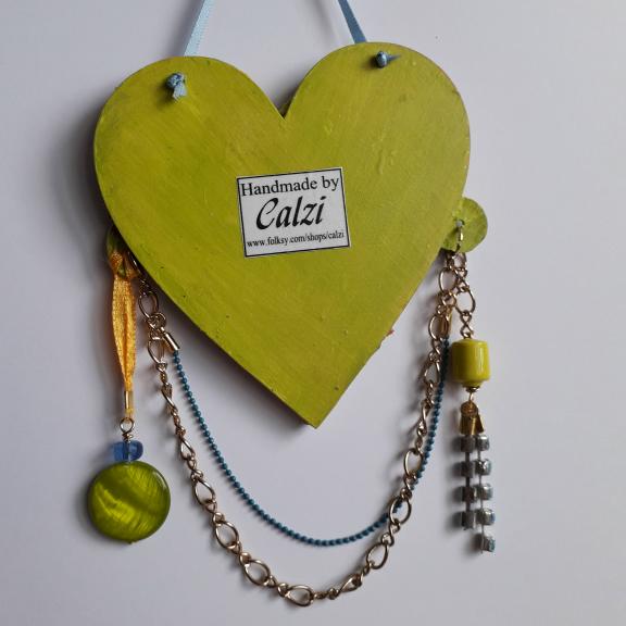 Attached to the heart is a gold tone fancy chain and a blue ball chain with a green glass barrel bead with pieces of blue diamante trim to one side and a green disc bead and blue glass bead suspended from orange ribbon on the other.