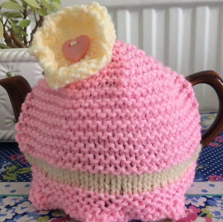 A pretty knitted lpink daisy cosy in pink with a cream daisy with a heart button centre. It is designed to fit up to and including a 1-2 cup 1/2 pt pot. Perfect for Mother's day