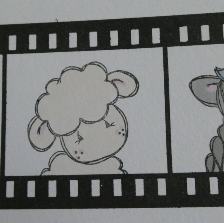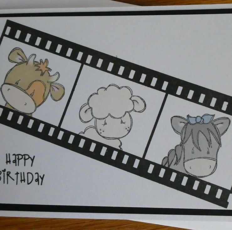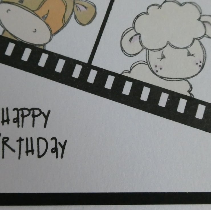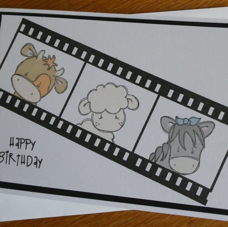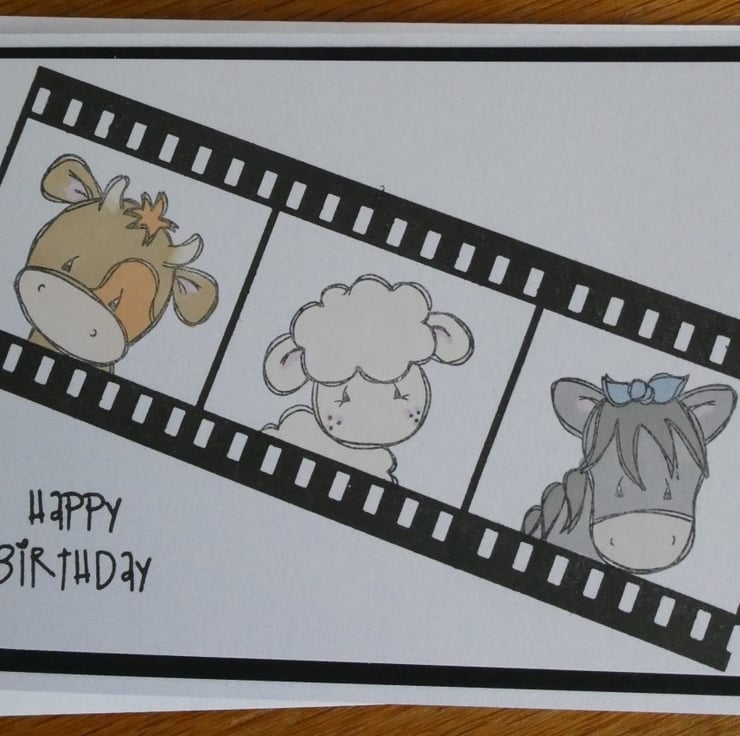 This cute birthday card has a film strip design with a series of pictures of farmyard animals, a cow, sheep and a donkey.