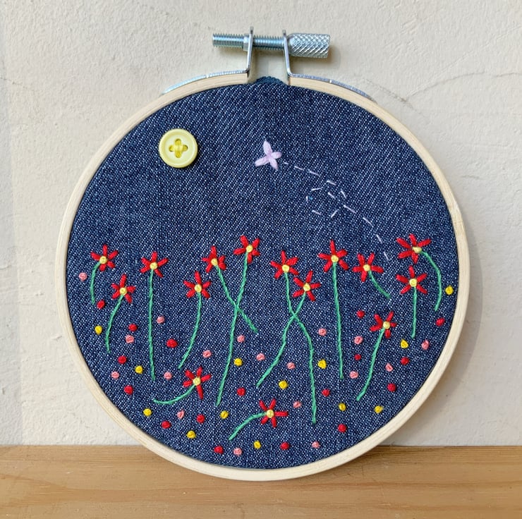This pretty design is hand sewn with wildflowers onto a bamboo embroidery hoop, which would make a cheerful addition to any room.