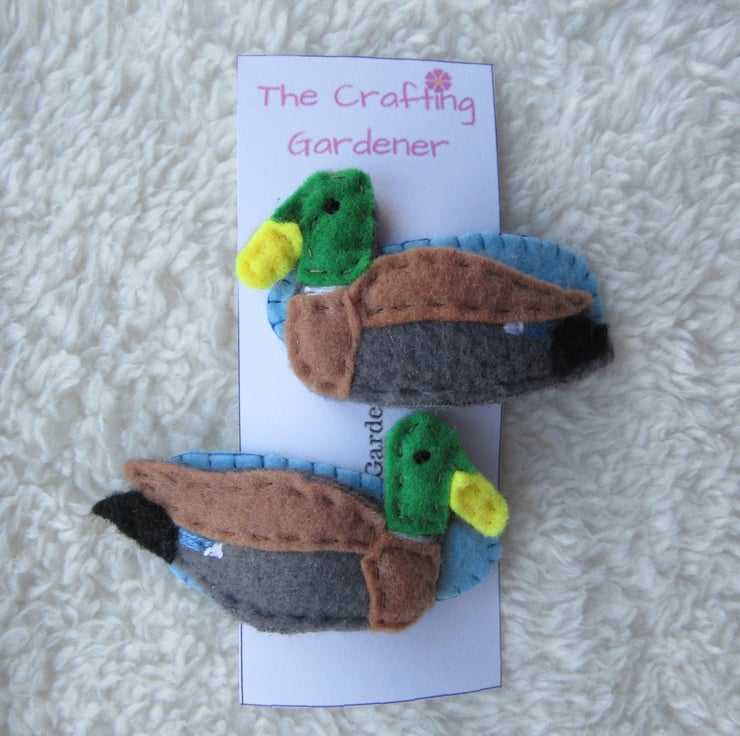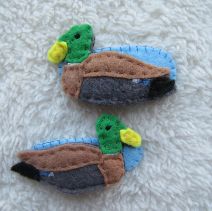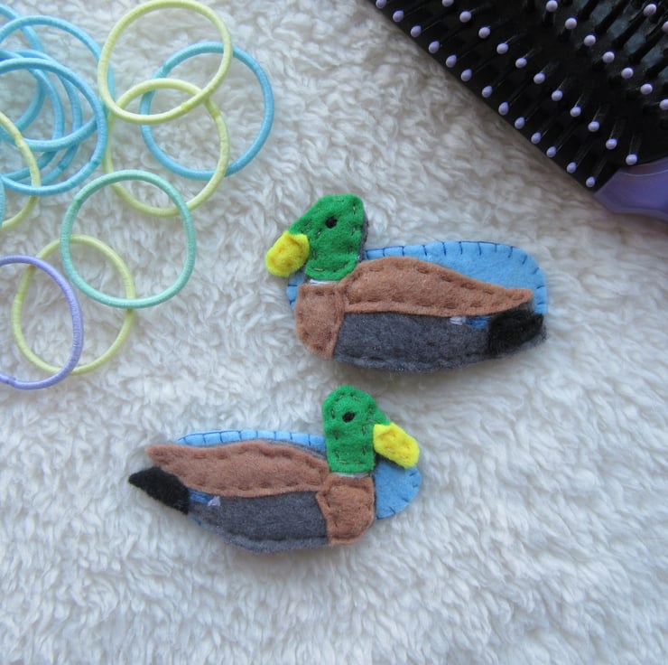 Duck hair clips, based on the widely seen male mallard duck, a favourite for feeding at the local pond.