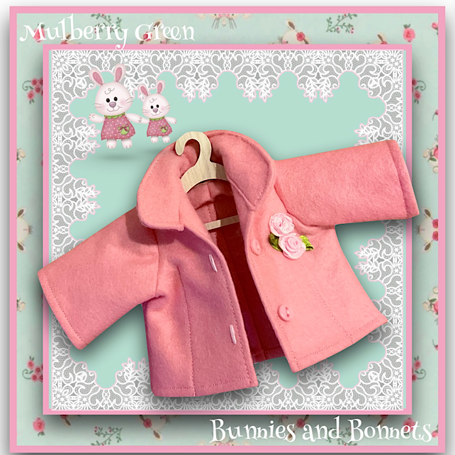 A beautiful tailored jacket to fit the Mulberry Green dolls. The jacket is in a lovely shade of rose pink and is decorated with little rose buds. It is finished two little buttons. A matching pink hat and shoes are also available in my shop.