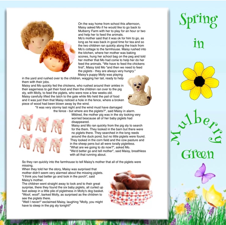 There are other children in Maisy’s class at school - Violet, Billy with his pet rabbit, Amber, Tilly, Rosie and her kittens, Amelia, Ruby, Marigold, Bobby with Max the dog, and the twins Oliver and Olivia, who have a puppy called Oscar. The dolls are all 26cm tall and baby Daisy is 16cm. Maisy and Mo love nothing more than having adventures with their friends. You can read about their adventures on my Facebook and Instagram pages - Maisy Muffin Rag Dolls and on my Mulberry Green Pinterest boards.